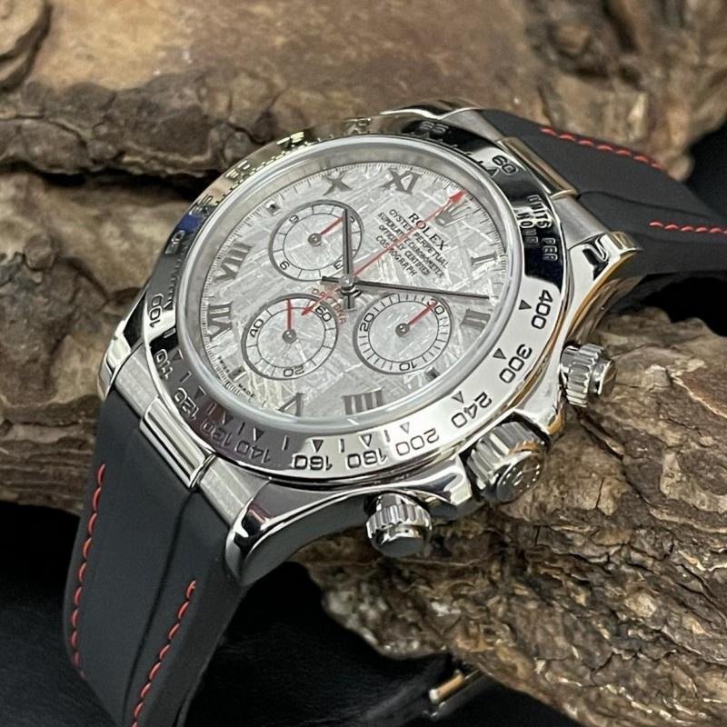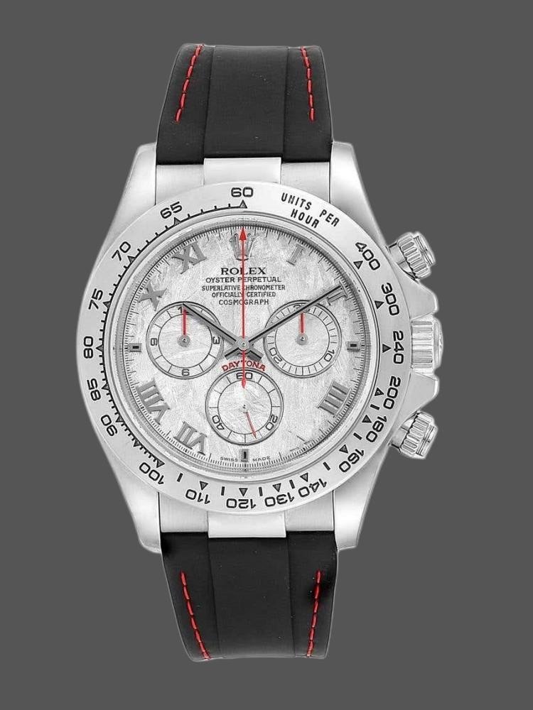 Rolex Oyster Perpetual Cosmograph Daytona 116519 Meteorite Dial 40 mm, replica for men. 40mm white gold case with white gold tachymeter bezel. Meteorite dial with black hands and Roman indexes. The red chronograph hands and subdials stand out and match perfectly with the shine of the Meteorite dial. Rubber strap with safety folding clasp. Compatible with dolls up to 18 cm.