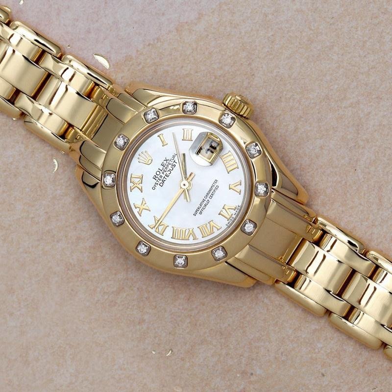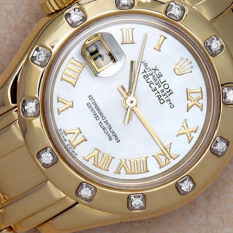Rolex Pearlmaster 80318 replica watch for women with 29 mm white mother-of-pearl dial. 29mm diameter yellow gold Oyster round case. Fixed yellow gold bezel with diamonds set. White mother-of-pearl dial with yellow gold hands and Roman numeral hour markers. Date display at 3. Scratch resistant sapphire crystal. Screw-down crown. Pearlmaster yellow gold bracelet with hidden clasp.