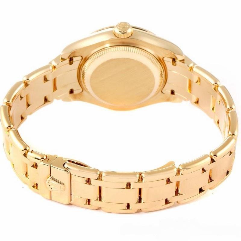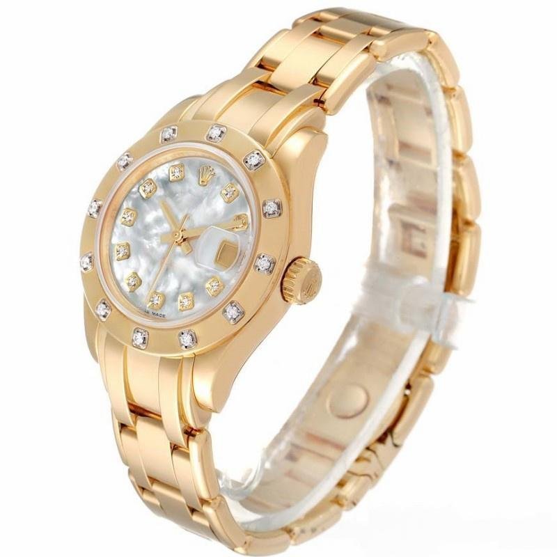 Rolex Pearlmaster 80318 replica watch for women with 29 mm diamond dial. 28mm solid yellow gold round case, solid yellow gold Pearlmaster bracelet and solid gold folding buckle. Solid yellow gold bezel with 12 diamonds set. Mother of pearl dial with 10 diamond set hour markers. The date is displayed in the window at 3 o’clock, under the traditional Rolex Cyclops lens. The date can be quickly adjusted using the instant date adjustment function, accessible via the crown. The dial is protected by a scratch-resistant sapphire crystal.