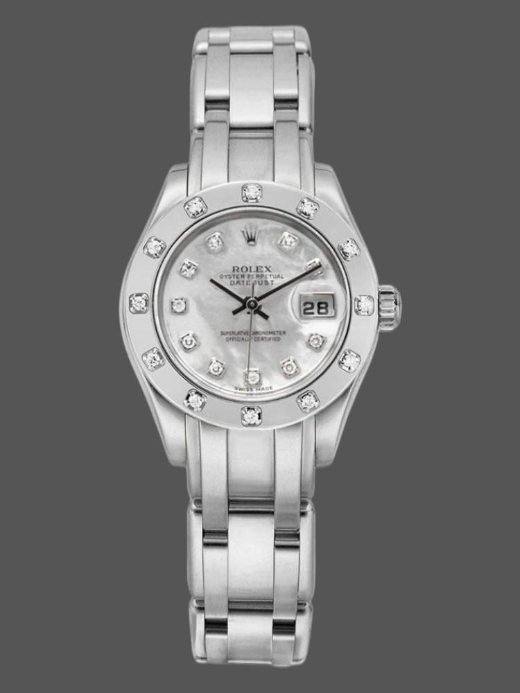 Rolex Pearlmaster 80319 MOP replica watch with 29 mm diamond dial for women. 29 mm diameter white gold Oyster case. White gold bezel with 12 diamonds set. Mother-of-pearl dial. Scratch resistant sapphire crystal with Cyclops magnifying glass. Calendar with window at 3. Pearlmaster white gold bracelet with hidden clasp.