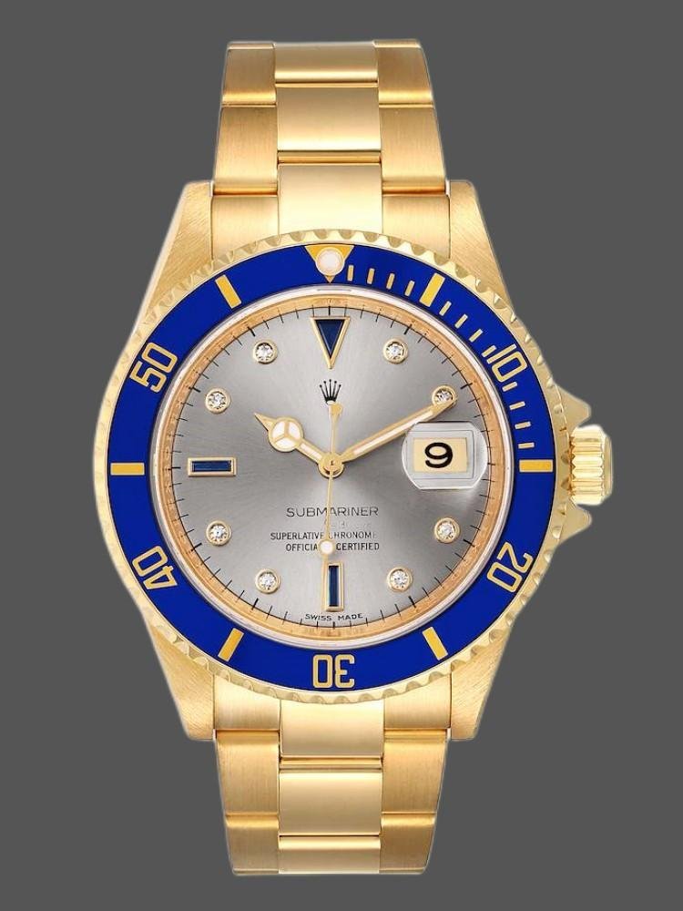 Rolex Submariner 16618 replica watch for men with Serti dial and 40 mm blue bezel. 40mm diameter yellow gold case. Unidirectional rotating bezel with special time-lapse with blue insert. Scratch resistant sapphire crystal with Cyclops magnifying glass. Serti slate dial with sapphire and diamond indexes. Luminescent needles. Calendar window at 3. Featuring matching yellow gold Oyster bracelet with polished center links and safety clasp.