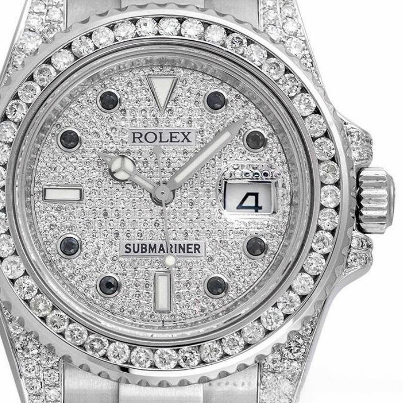 Rolex Submariner Date 116610LN Custom Diamond 40 mm watch for men, replica, 40mm stainless steel case, with round brilliant diamonds on the handles. This watch features a custom bezel set with diamonds, a custom dial with pav?? diamonds and black indexes, numbers, date window with magnifying glass at 3 o’clock, sapphire crystal and stainless steel Oyster bracelet with Oysterlock folding safety clasp.