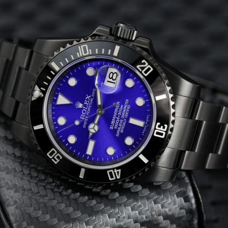 The Rolex Submariner Date 116610LN, men’s replica, blue dial, stainless steel with black PVD/DLC coating, 40 mm, round stainless steel case with 40 mm DLC/PVD coating, screw-down crown and ceramic bezel. Custom blue dial with hour markers with luminescent dots. Recorded 60-minute scale and graduations on the bezel. Numbers, date window with magnifying glass at 3 o’clock, sapphire crystal, unidirectional rotating bezel. The reliable DLC/PVD coated stainless steel Rolex Oyster bracelet will look perfect on your wrist.