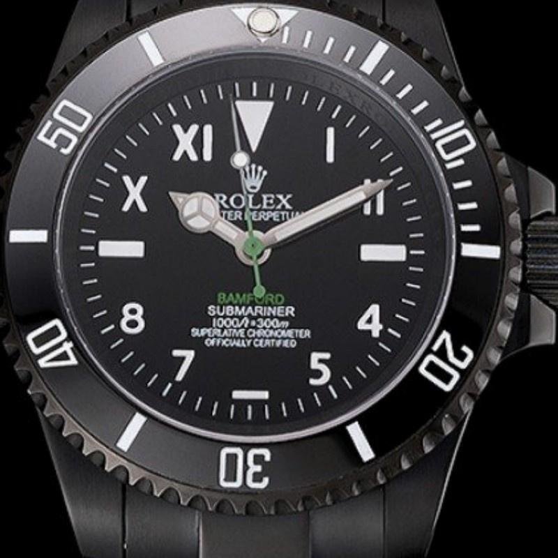 Men’s Rolex Submariner PR16233BBL Automatic Watch, Black Dial, 41mm, 41 mm diameter stainless steel case. Openwork bezel with engraved 24-hour luminous marker. The black dial, composed of Roman and Arabic numerals, was originally designed for Allied forces during World War II. The watch features a black California dial with white graphics, giving it a unique and contemporary look. The dial is also signed in green Bamford above the text at 6 o’clock, with ion-plated stainless steel link bracelet.