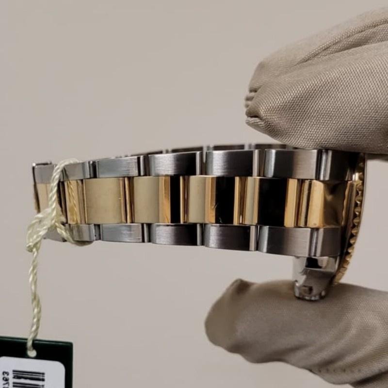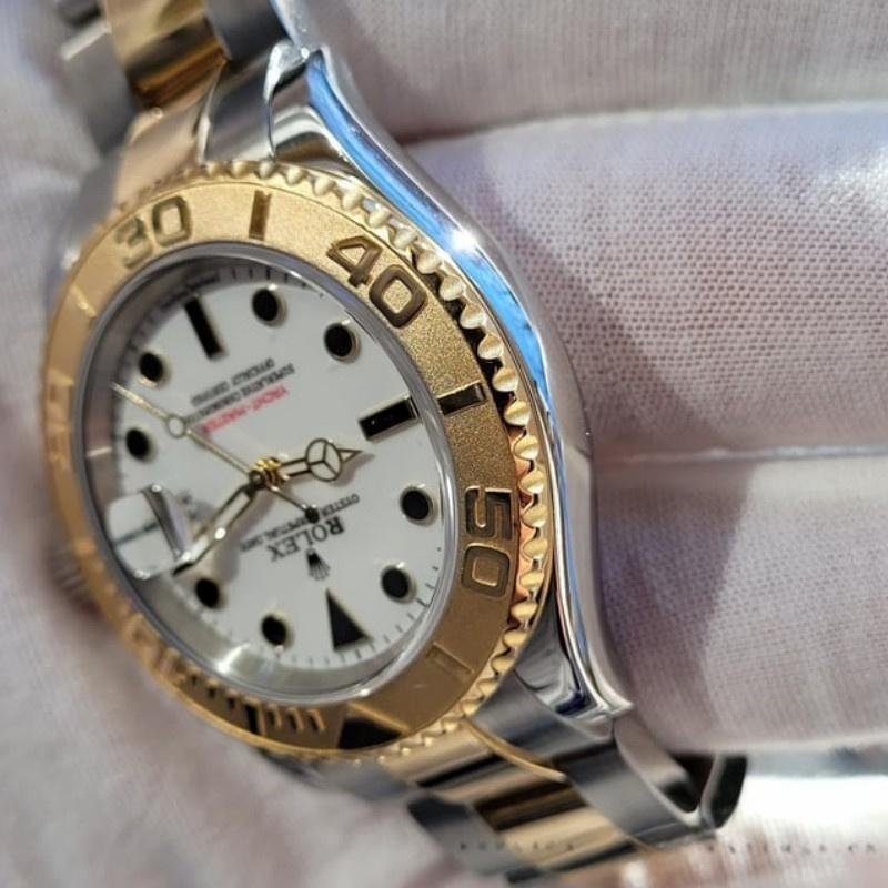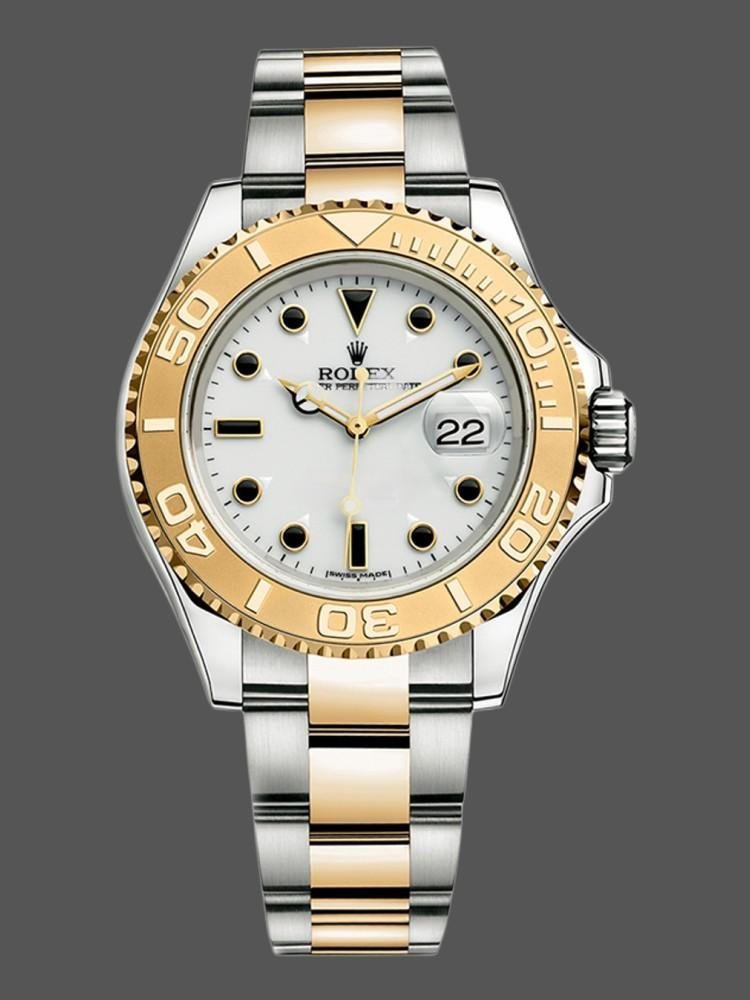 Rolex Yacht-Master 16623 watch with 40 mm gold bezel for men. This Rolex has undergone a thorough inspection for water resistance, accuracy, functionality and condition to determine the level of reconditioning necessary to meet our strict standards. It comes in the same thin 40mm stainless steel. The case fits the wrist with an Oyster bracelet and features a bi-directional rotating bezel, as well as a screw-down crown flanked by steel protectors. The contrasting white dial has a sober appearance but is very legible. The polished handles and two-tone bracelet with polished center links add a luxurious touch.