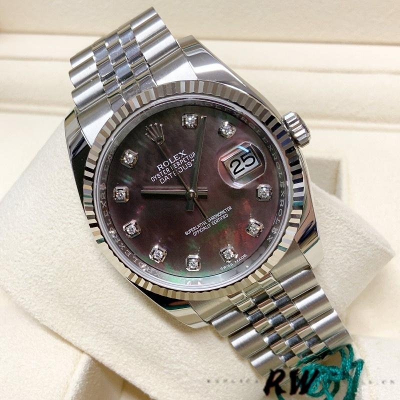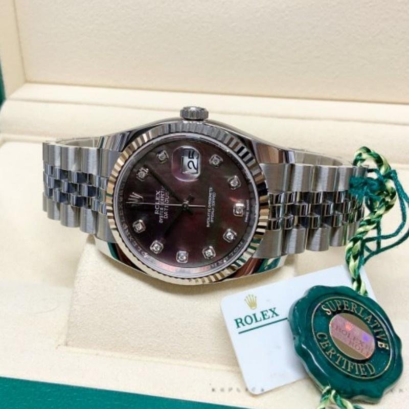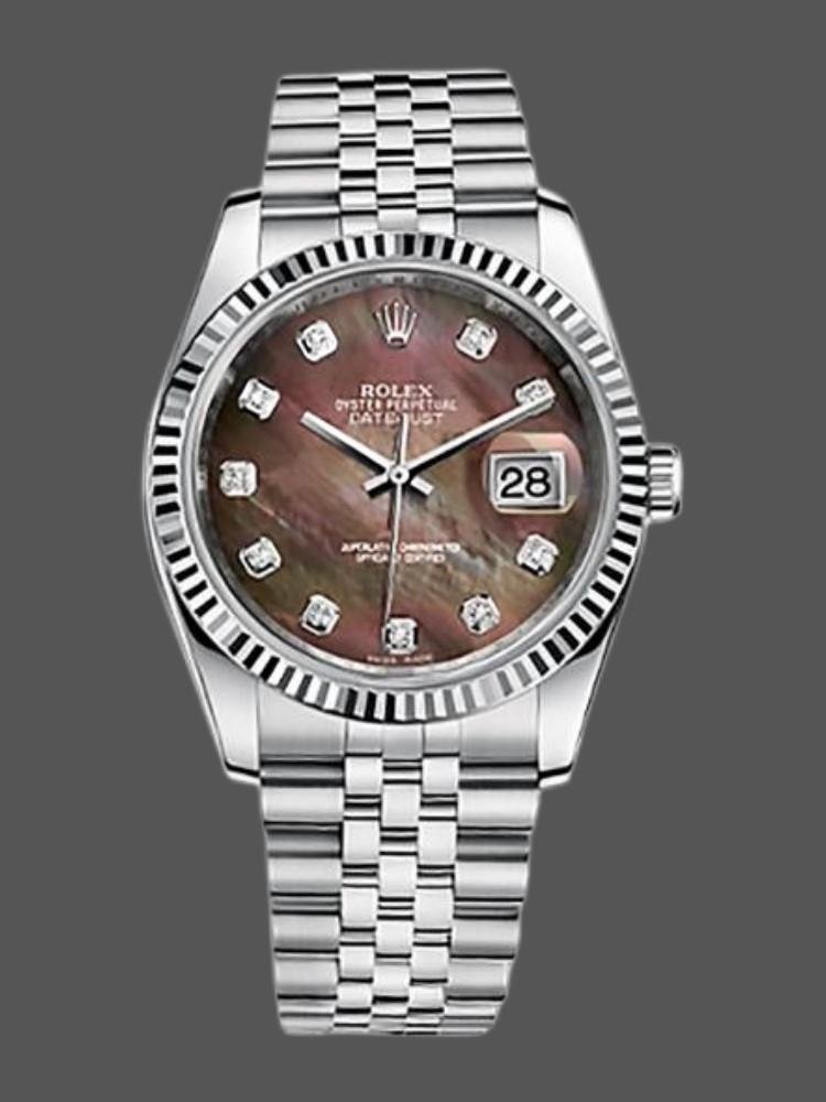 Replica of the unisex Rolex Datejust 116234 watch with black mother-of-pearl dial and 36 mm diamonds