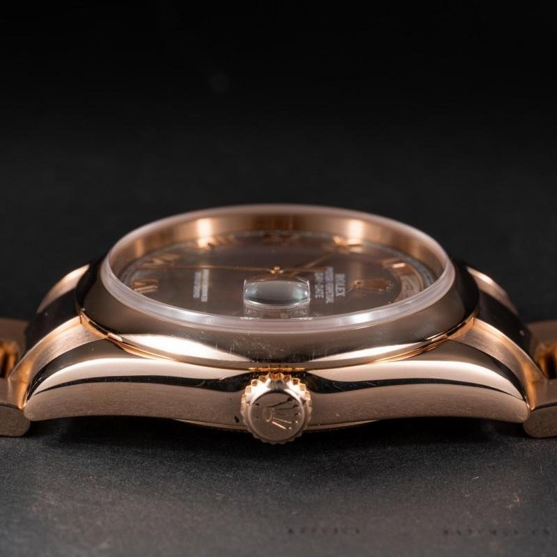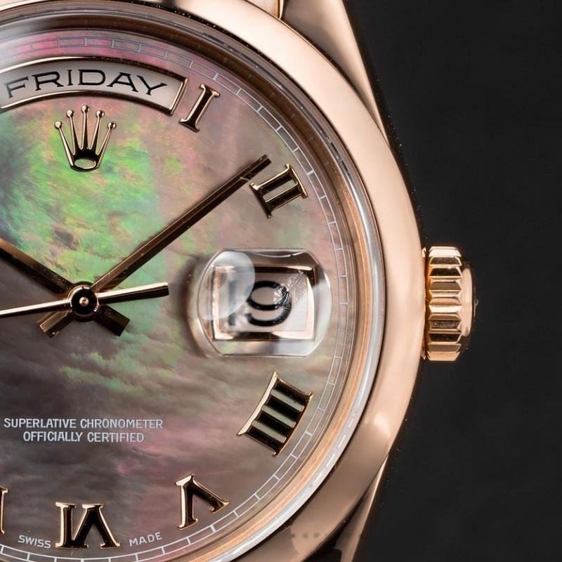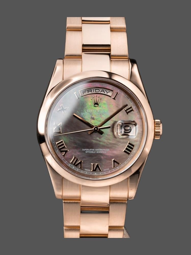 Rolex Day-Date 118205 unisex replica watch with 36mm Roman numeral dial. 36 mm diameter rose gold case. Rose gold domed bezel and President bracelet. Screw-down crown. Scratch resistant sapphire crystal. Tahitian mother-of-pearl dial with embossed Roman numerals. Calendar window at 3.