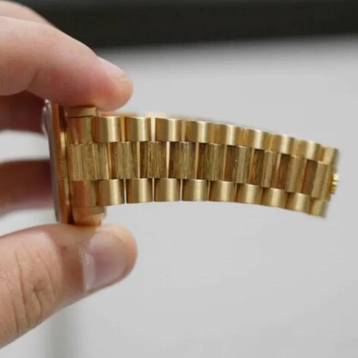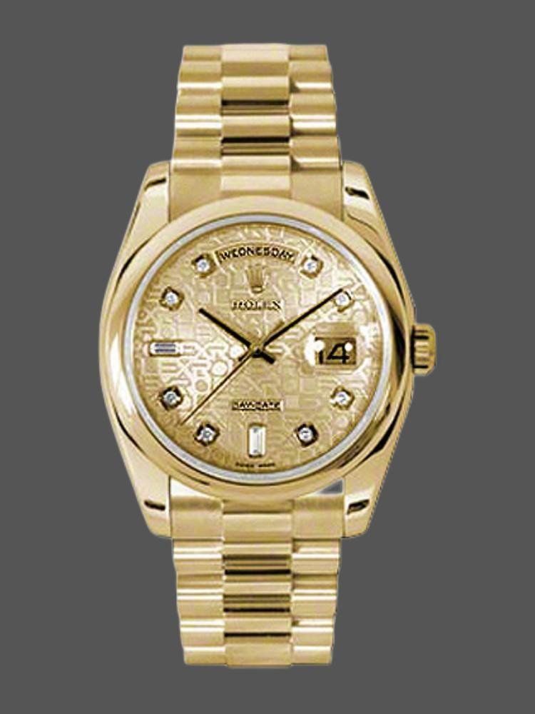 Rolex Day-Date 118208 Champagne Jubilee Dial 36 mm unisex replica watch. 36mm yellow gold case with yellow gold President bracelet. Fixed yellow gold domed bezel. Mother-of-pearl dial with diamond hour markers and two baguettes instead of six and nine, with Spanish days instead of twelve, polished bezel and yellow gold President bracelet. Scratch resistant sapphire crystal. Screw-down crown. Solid caseback.