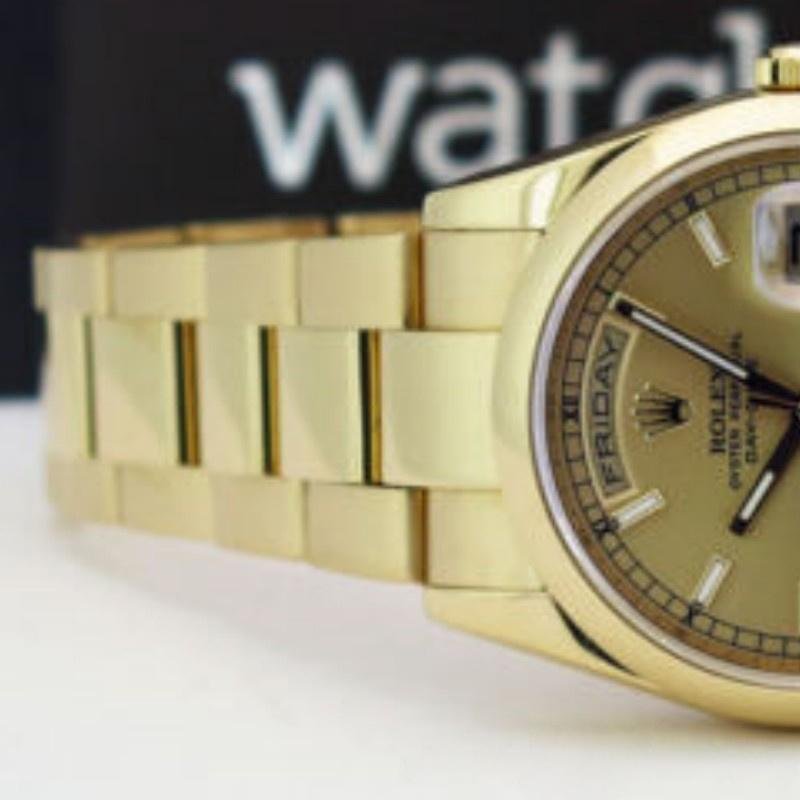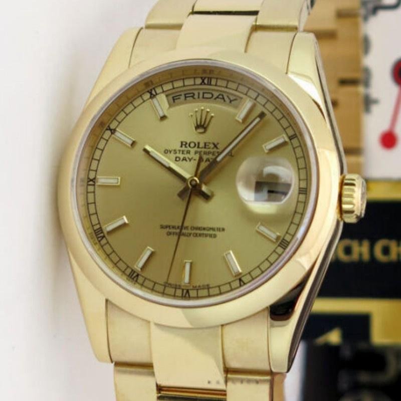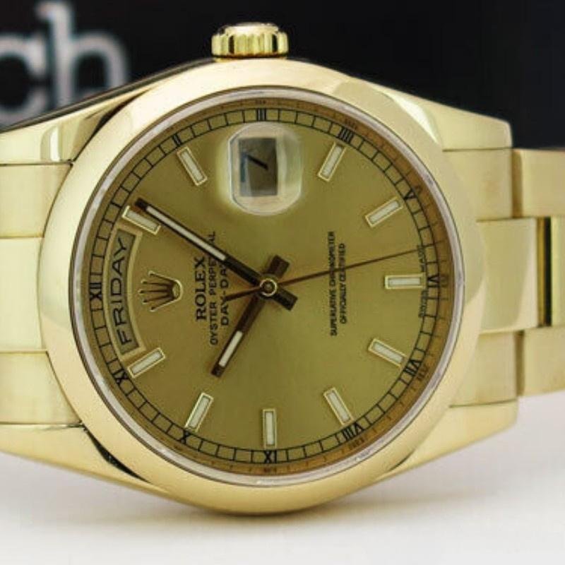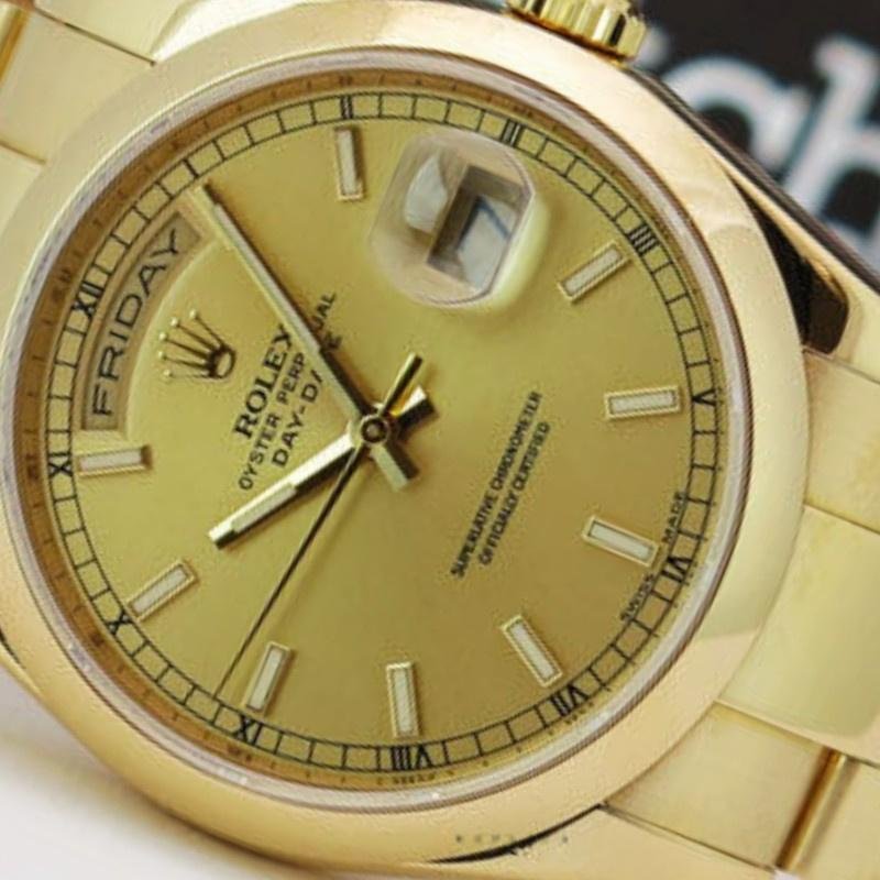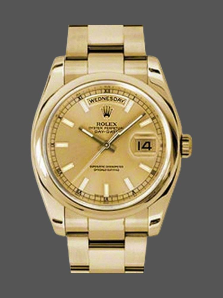 Rolex Day-Date 118208 unisex replica watch with 36 mm champagne dial. 36mm yellow gold case with yellow gold Rolex President bracelet. Fixed yellow gold domed bezel. Champagne-colored dial with hourly indexes. Minute markers around the outer edge. Date display at 3. Viewing the day of the week centered at 12. Scratch resistant sapphire crystal. Screw-down crown. Solid caseback. Round box.