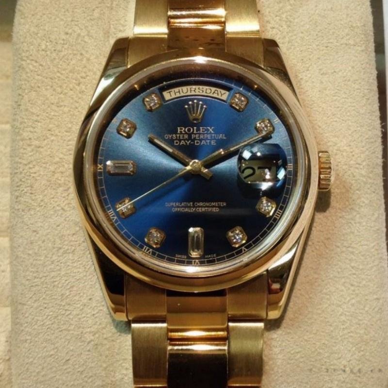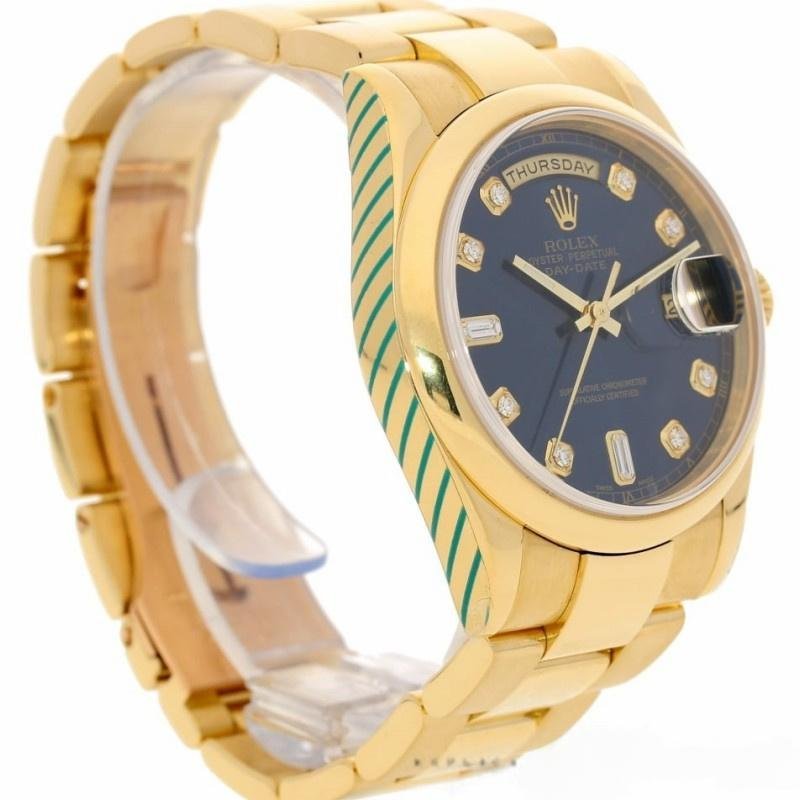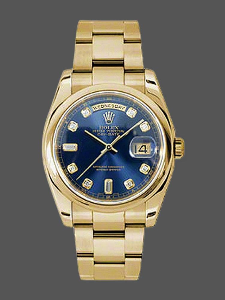 The Rolex Day-Date 118208, unisex replica with 36mm blue diamond dial, features a 36mm round yellow gold case with screw-down crown and yellow gold bezel. This Day-Date features an attractive blue dial with diamond markers. The reliable yellow gold President bracelet will look great on your wrist.