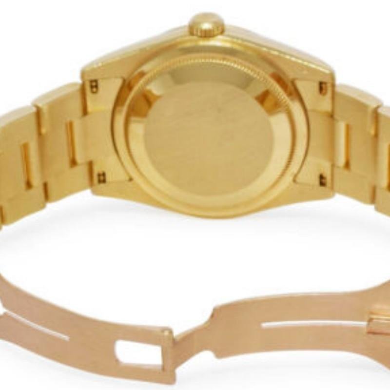 Rolex Day-Date 118208 unisex replica watch with champagne dial and 36 mm diamonds. 36mm yellow gold case with yellow gold Rolex President bracelet. Fixed yellow gold domed bezel. Champagne-colored dial with diamonds set. Minute markers around the outer edge. Date display at 3. Viewing the day of the week centered at 12. Scratch resistant sapphire crystal. Screw-down crown. Solid caseback. Round box.