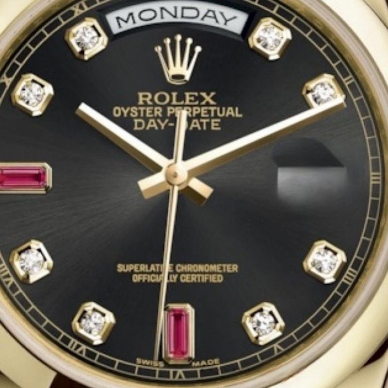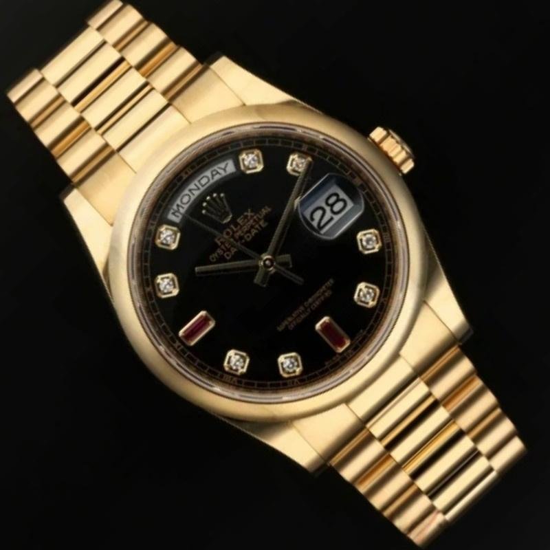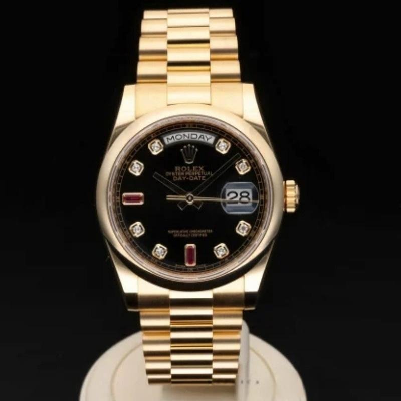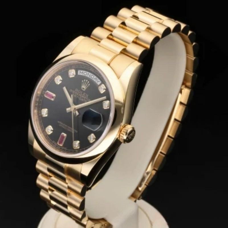 Rolex Day-Date 118208 unisex replica watch with black dial and 36 mm diamonds. 36mm yellow gold case with yellow gold Rolex President bracelet. Fixed yellow gold domed bezel. Black dial with gold hands and diamond hour indices. Minute trees around the outer edge. Date display at 3. Viewing the day of the week centered at 12. Scratch resistant sapphire crystal. Screw-down crown. Solid caseback. Round box.