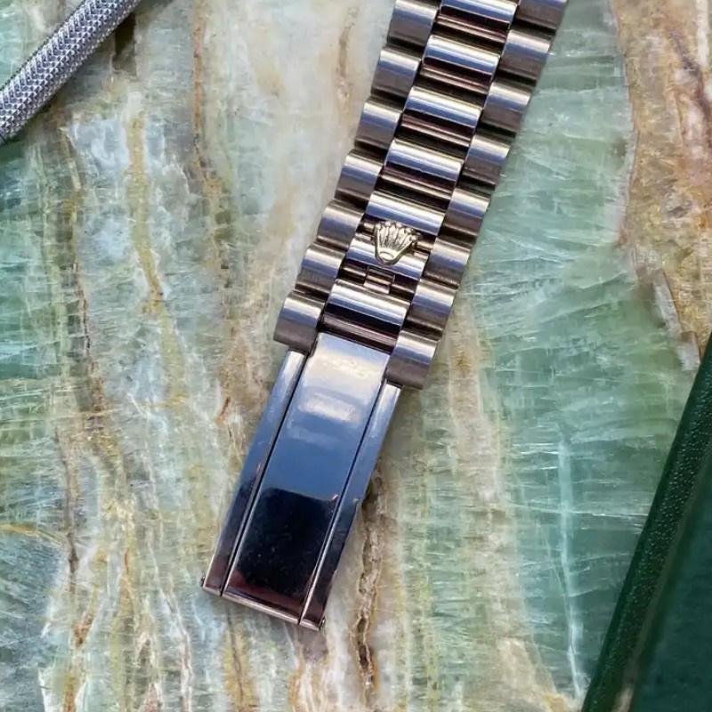 Unisex Rolex Day-Date 118209 replica watch with Oyster bracelet, white dial, 36 mm. 36mm white gold case, white gold caseback and white gold bracelet. As usual on a Day Date, it includes a magnifying cyclops on the sapphire crystal at 3 o’clock and a day window at 12 o’clock, which is adjusted by quick adjustment. The white dial includes manufacturer serial numbers. The President style bracelet includes an invisible folding clasp.