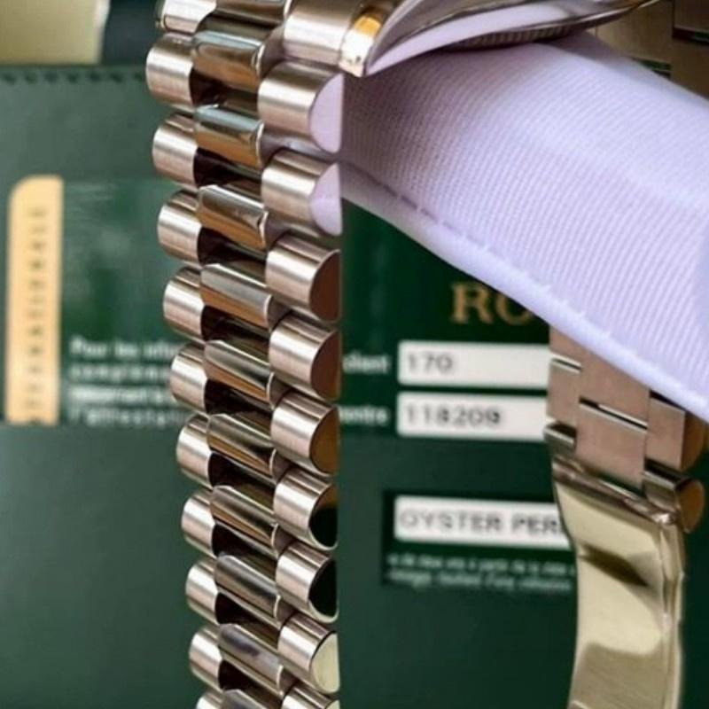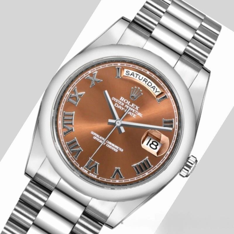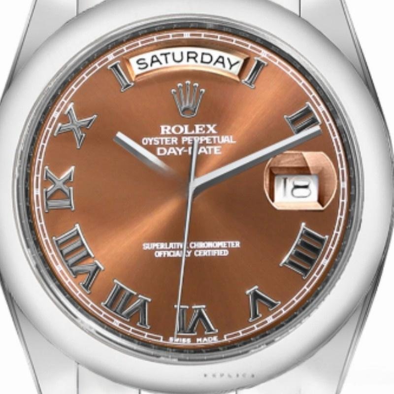 Rolex Day-Date 118209 unisex replica watch with 36mm copper brown dial. 36mm white gold case. Chocolate brown dial with Roman numerals, manufacturer’s serial numbers and minute markers on the outer edge. Date display at 3. Polished bezel, white gold domed bezel and Oyster bracelet. Scratch-resistant sapphire crystal.