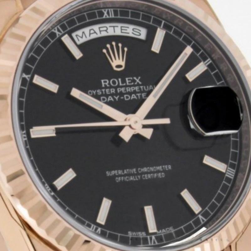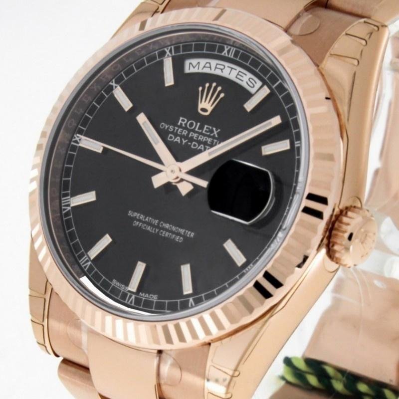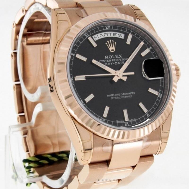 Rolex Day-Date 118235 replica watch, black dial, fluted bezel, 36 mm, unisex. 36mm Everose gold case with Everose gold President bracelet. Everose gold fluted fixed bezel. Black dial with rose gold hands and indexes. Minute trees on the outer edge. Date at 3 a.m.; day at 12 noon. Scratch resistant sapphire crystal. Screw-down crown. Solid caseback.