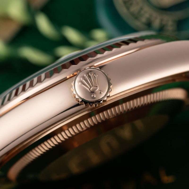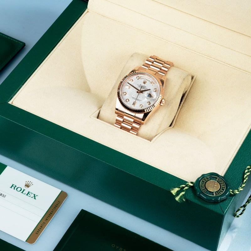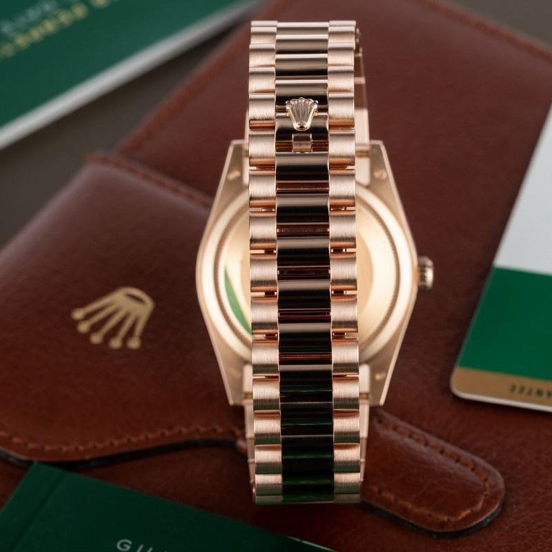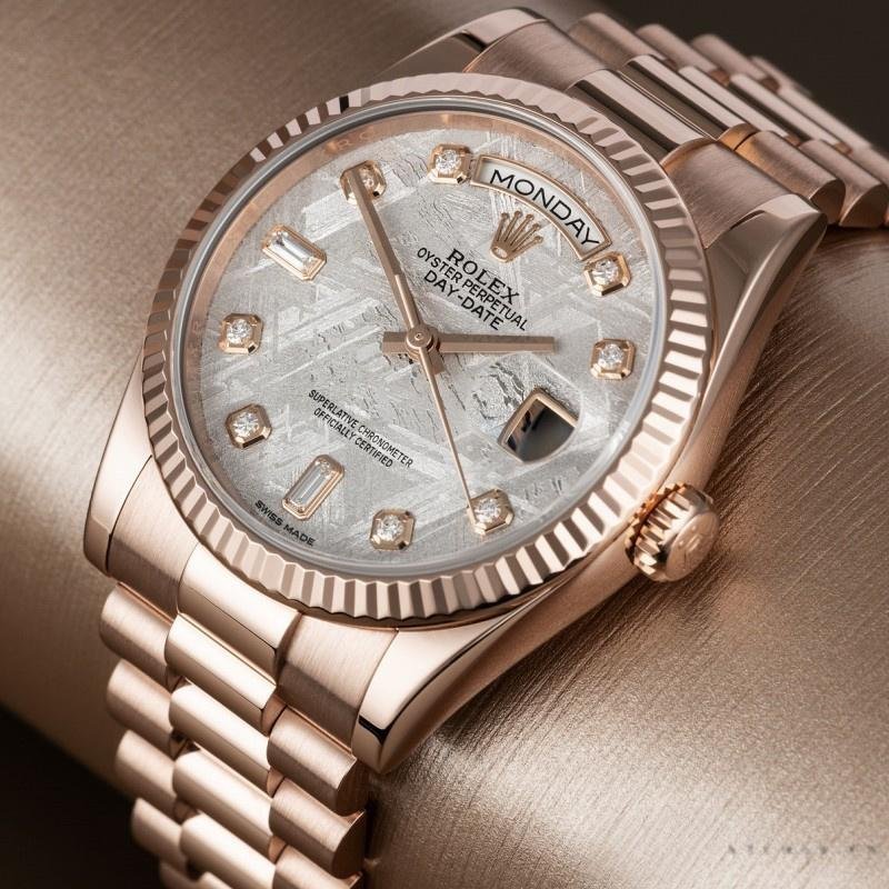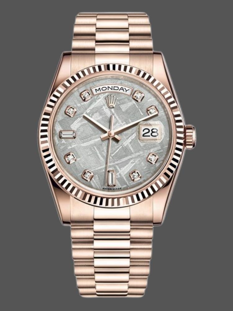 The Rolex Day-Date 118235 Everose Gold Meteorite, diamond dial, 36 mm, unisex replica, it features a 36mm rose gold case with a screw-down crown and rose gold fluted bezel. It features an impressive and exceptional dial set with meteorite diamonds. Diamonds set in gold and baguette cut diamonds at 6 and 9. The reliable rose gold President bracelet will look great on your wrist.