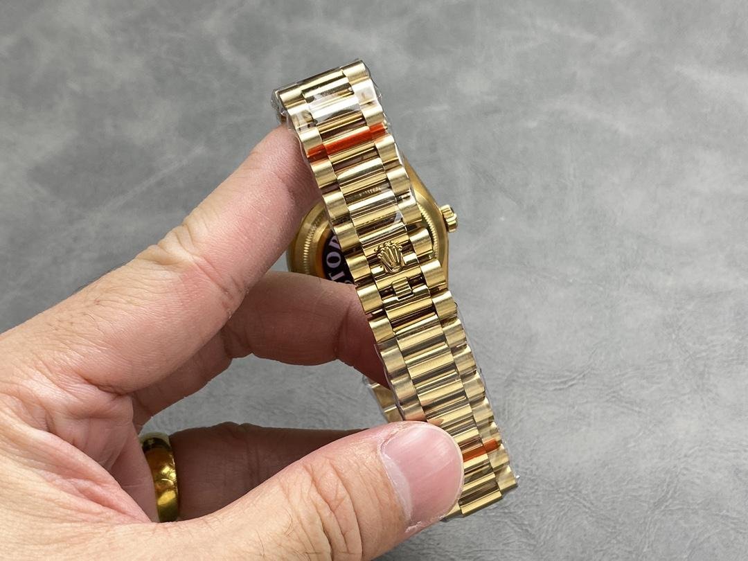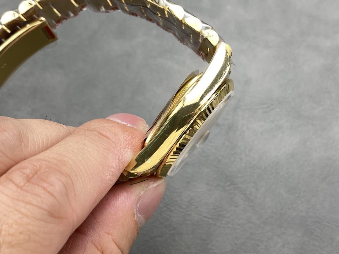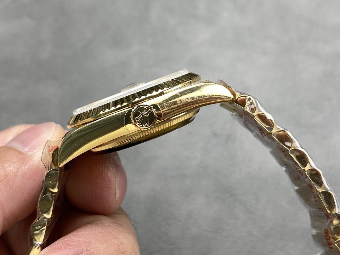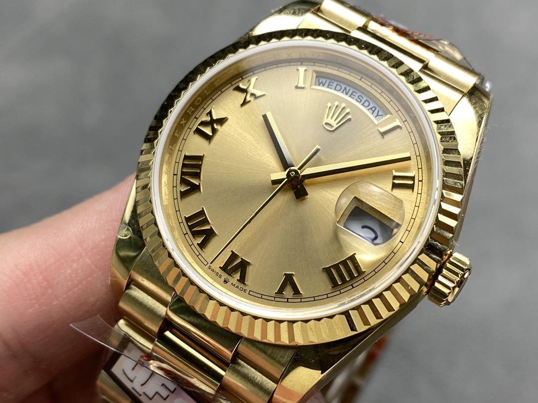Rolex Day-Date 118238 – Unisex 36mm replica with champagne dial. 36mm yellow gold case with yellow gold Rolex President bracelet. Fixed yellow gold ribbed bezel. Champagne-colored dial with yellow gold hands and Roman numeral hour markers. Minute markers around the outer edge. Date display at 3 o’clock. Viewing the day of the week at 12. Scratch resistant sapphire crystal. Screw-down crown. Solid caseback.