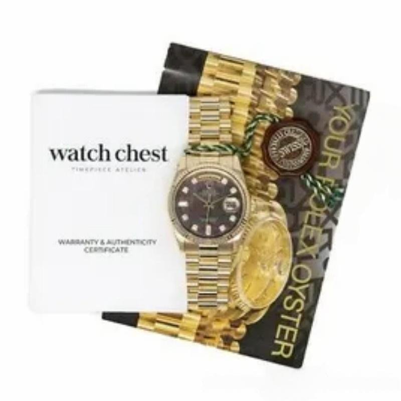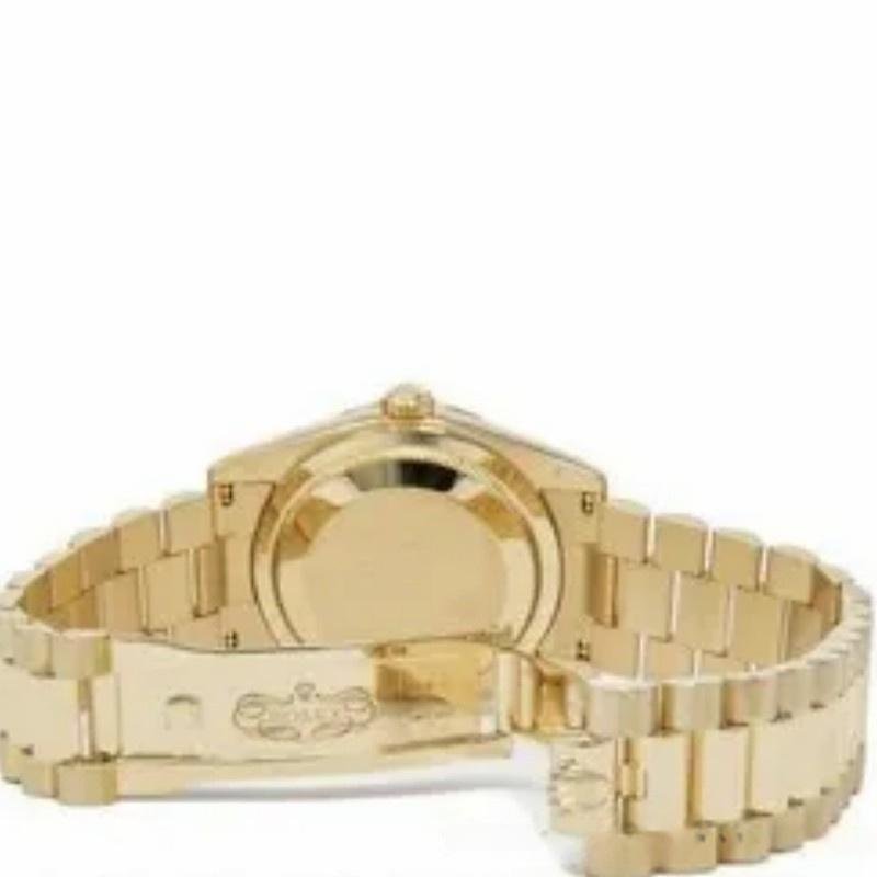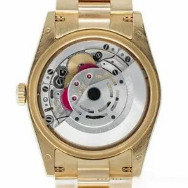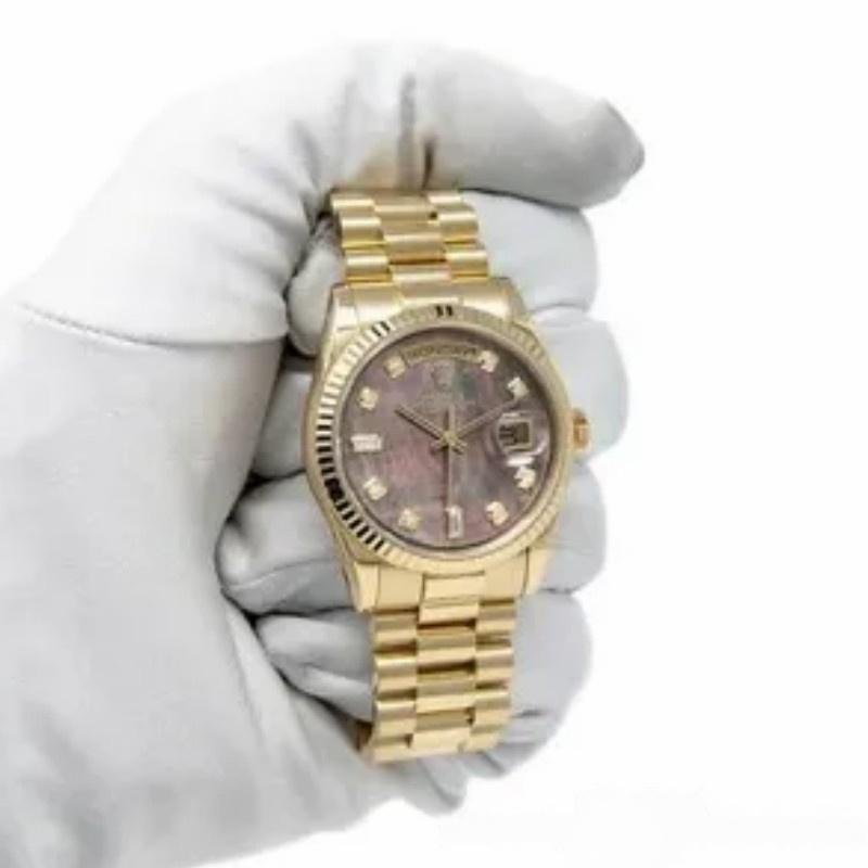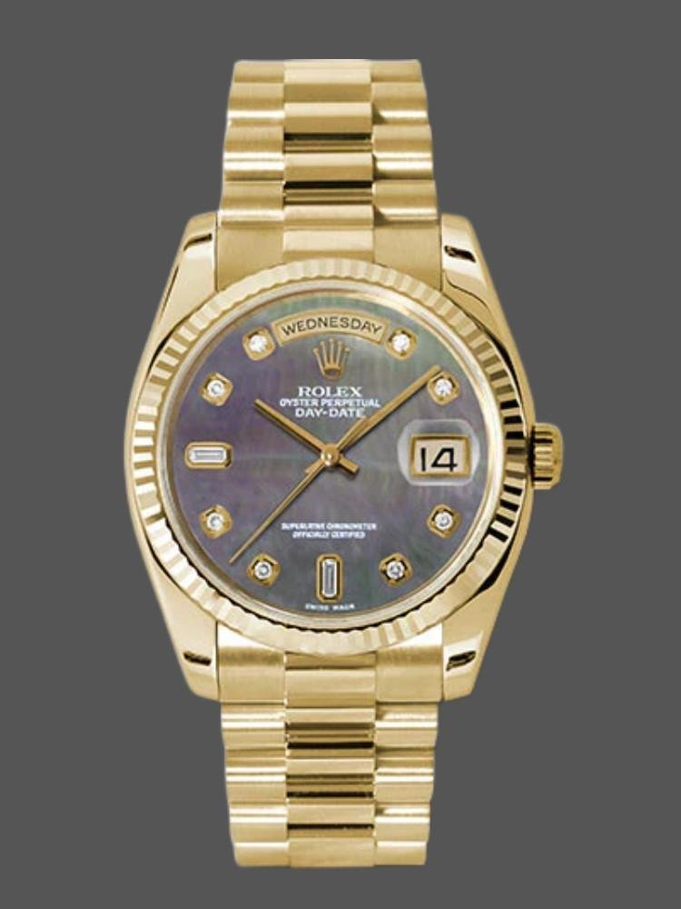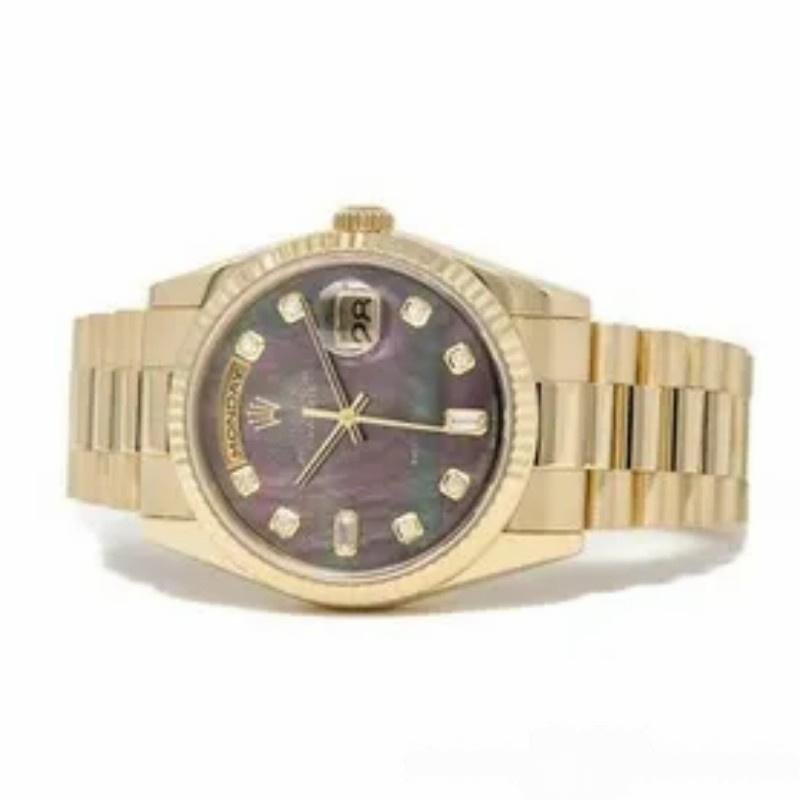 The 36mm Rolex Day-Date 118238 Dark Mother of Pearl, unisex replica, features a 36mm round yellow gold case with screw-down crown and yellow gold fluted bezel. Dark mother-of-pearl dial with yellow gold tone hands and diamond hour markers. Date display at 3 o’clock. Viewing the day at 12. Scratch resistant sapphire crystal. Screw-down crown. Solid caseback. The reliable yellow gold Oyster bracelet will look great on your wrist.