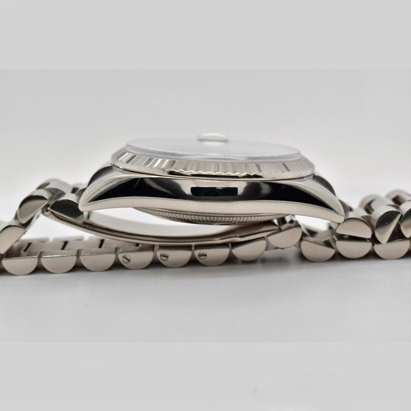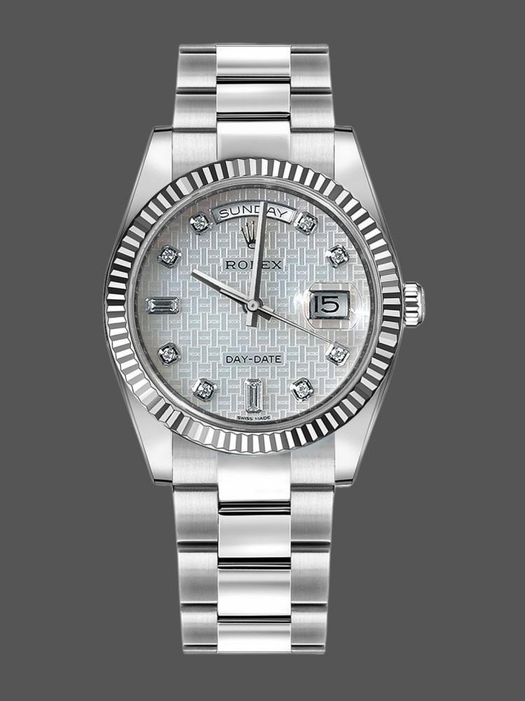 Rolex Day-Date 118239 unisex replica watch with mother-of-pearl dial and 36 mm. 36mm white gold case with white gold Rolex Oyster bracelet. White gold ribbed fixed bezel. Unique white platinum mother-of-pearl dial with Oxford guilloch?? motif and diamond indexes. Glitter of 8 round diamonds and 2 baguettes at 6 and 9 a.m. Day of the week window at 12 noon. Date window at 3 o’clock with cyclops magnifying glass. Scratch resistant sapphire crystal. Screw-down crown.