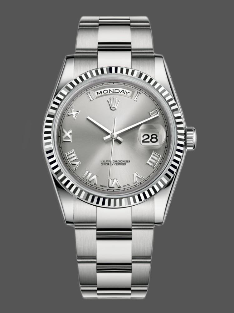 Rolex Day-Date 118239 unisex replica watch in white gold, silver, with Roman numerals, 36 mm. 36mm white gold case with white gold Rolex Oyster bracelet. White gold ribbed fixed bezel. Silver dial with Roman numerals. Day of the week window at 12. Date window at 3 o’clock with cyclops magnifying glass. Scratch resistant sapphire crystal. Screw-down crown.