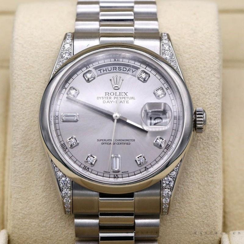 Rolex Day-Date 118296 Platinum Watch, White Mother-of-pearl and Diamond Dial, 36mm Unisex Replica. 36mm diameter platinum Oyster case. Plain platinum domed bezel. Silver dial with silver hands and diamond indexes. Minute trees around the outer edge. Date window extended to 3 and 12 for the days of the week. Polished barrel-shaped case with screwed Oyster bottom. Platinum presidential bracelet with hidden clasp.
