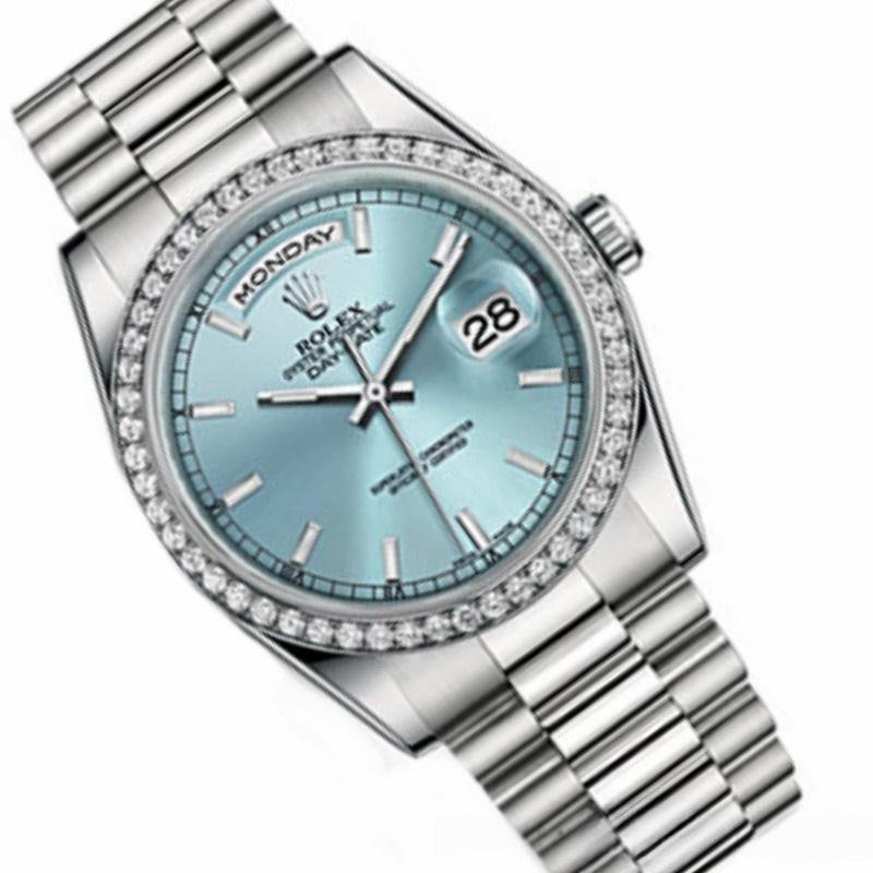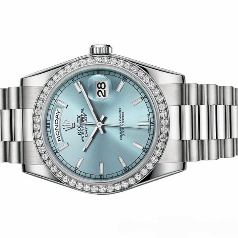 Replica of the unisex Rolex Day Date 118346 watch with ice blue dial and 36 mm diamonds