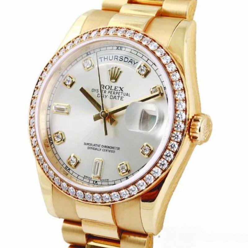 Automatic: Lifetime water resistant, Swiss: 30 meters, TOP: 100 meters Availability: Available item Return policy: If you are not satisfied with our product, please return the watch within 30 days for a full refund. Condiciones return. Rolex Day-Date 118348 watch, diamond silver dial, 36 mm, unisex. 36mm yellow gold round case with screw-down crown and diamond bezel. Silver dial with diamonds set. Day of the week window at 12. Date window at 3 o’clock with cyclops magnifying glass. The dial is surrounded by a round bezel set with brilliant-cut diamonds. The elegant design with hidden folding crown closure will give you a flawless look. Recommendation: Choose TOP SWISS or Swiss movement Customer reviews