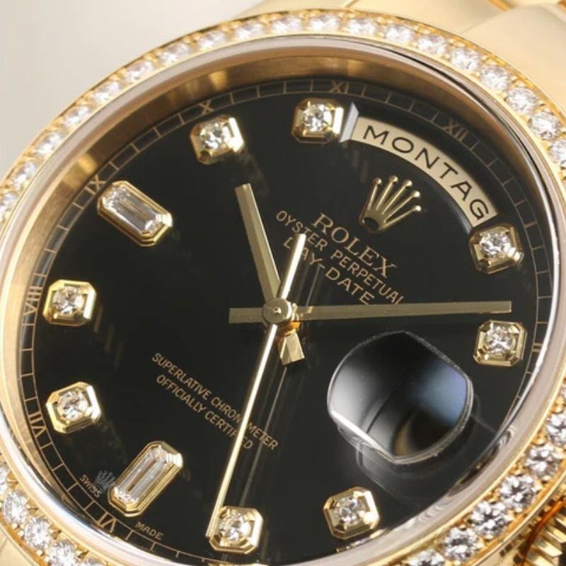 Religible replica Rolex Day Date 118348 yellow gold watch with 36mm black diamond dial. 36mm yellow gold case with black dial, baguette diamond hour markers at 6 and 9, date display at 3 and day of the week window at 12 with cyclops magnifying glass. The dial is surrounded by a round bezel set with brilliant-cut diamonds. The elegant hidden folding crown closure will look perfect on your wrist.
