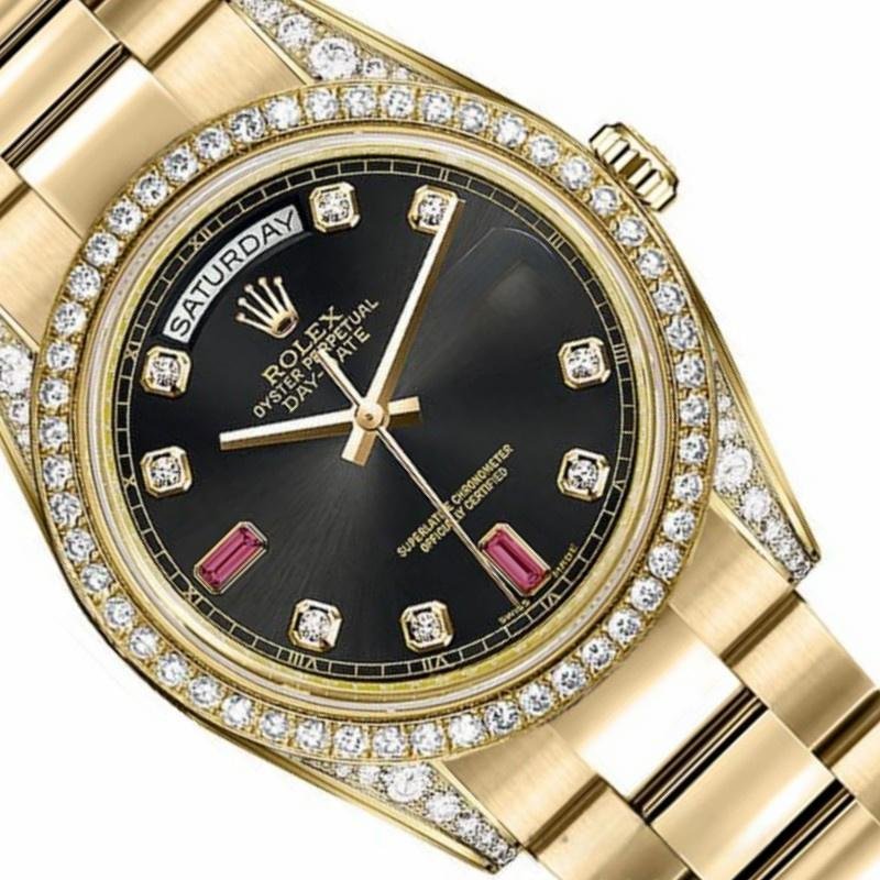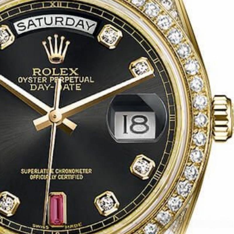 The Rolex Day-Date 118388, unisex replica with black dial and rubies, 36 mm, it features a 36mm yellow gold case set with diamonds and a black dial set, diamond-encrusted handles, matching diamond bezel, 8 round diamonds and 2 baguette-shaped ruby hour indices. Polished yellow gold hands, hour and minute hands, scratch resistant sapphire crystal with Cyclops magnifying glass. Day of the week window at 12. Date window at 3. Its elegant design with hidden folding crown closure will give a touch of class to your wrist.