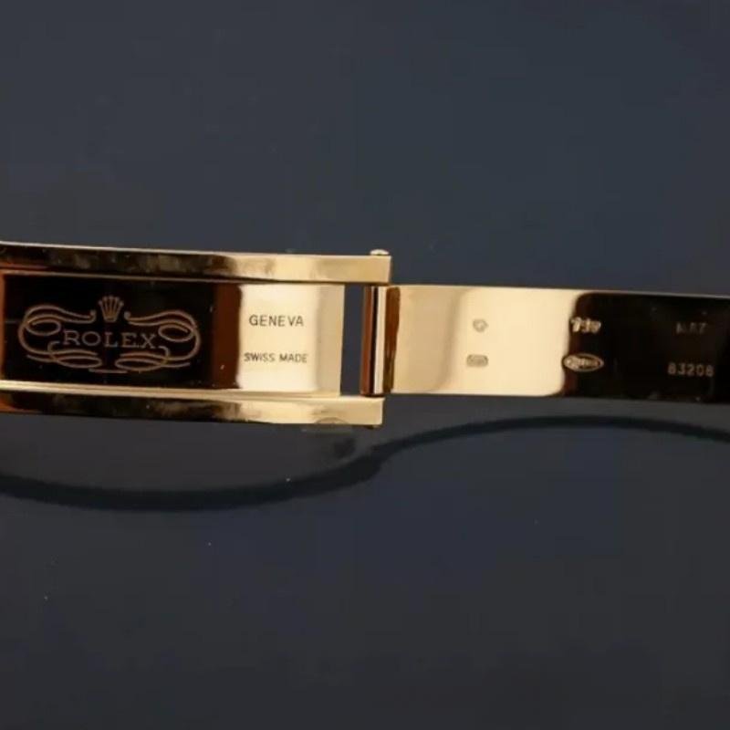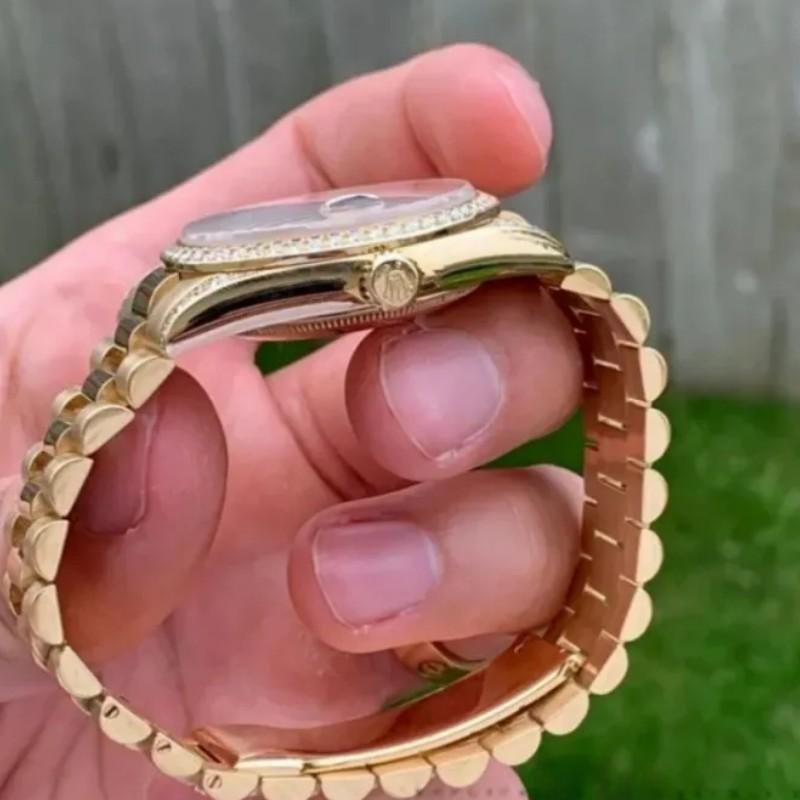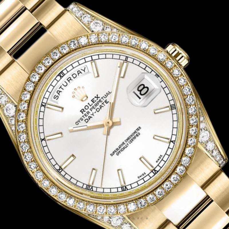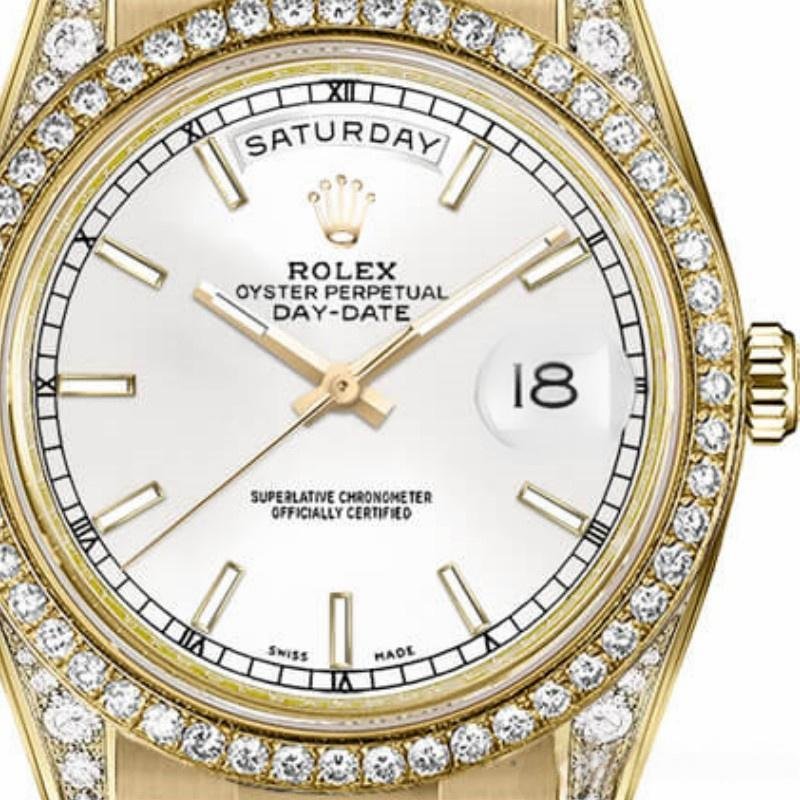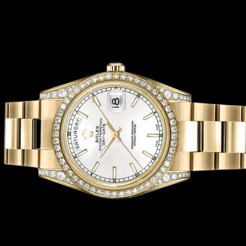 The Rolex Day-Date 118388, unisex replica in yellow gold and 36 mm white dial, it features a diamond-set 36mm yellow gold case, white dial with indexes, diamond-encrusted handles, matching diamond bezel, hour and minute hands, and scratch-resistant sapphire crystal with Cyclops magnifying glass. Window for the day of the week at 12. Window for the date at 3. Its elegant design with hidden folding crown closure will give a touch of class to your wrist.