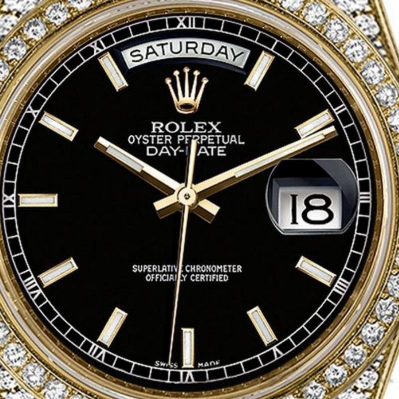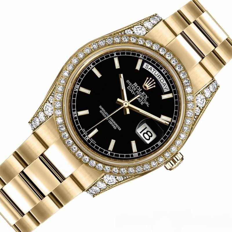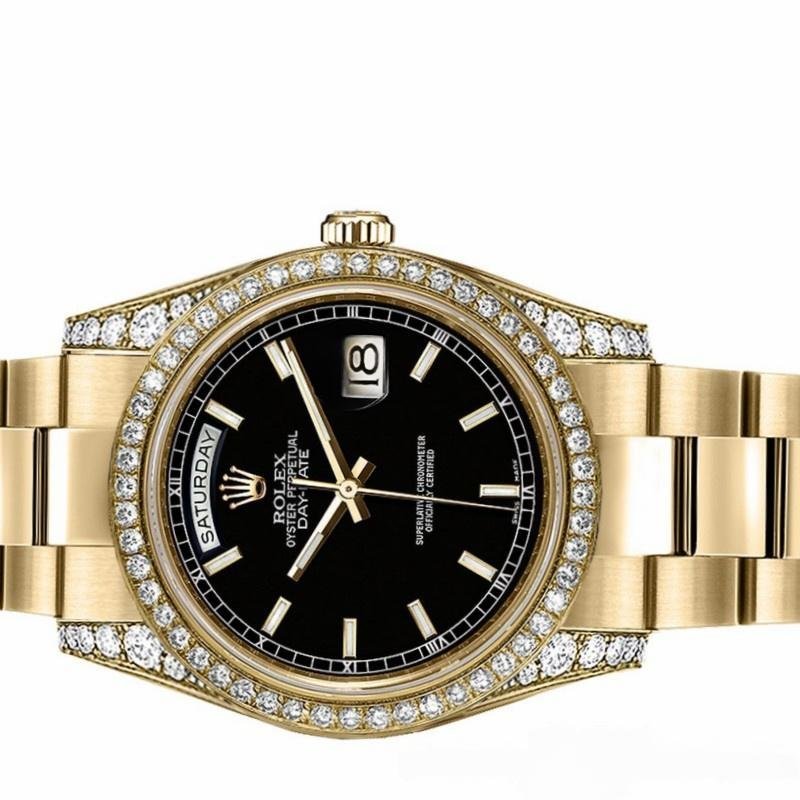 The Rolex Day-Date 118388, unisex yellow gold replica with black dial and indexes, 36 mm, it features a 36mm yellow gold case set with diamonds, black dial hour indices, diamond-encrusted handles, matching diamond bezel, hour and minute hands, and scratch-resistant sapphire crystal with Cyclops magnifying glass. Day of the week window at 12. Date window at 3. The elegant design with hidden folding crown closure will add a touch of class to your wrist.