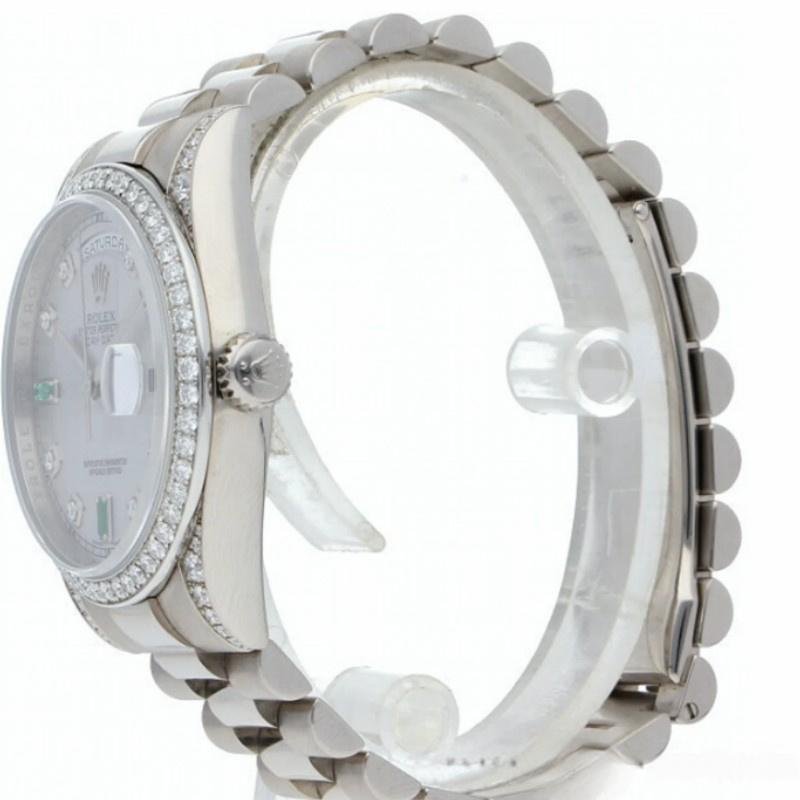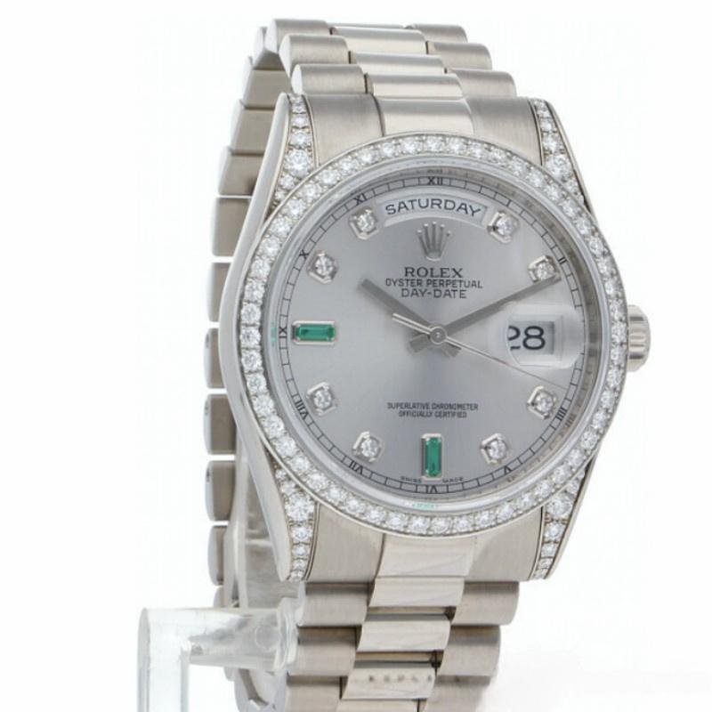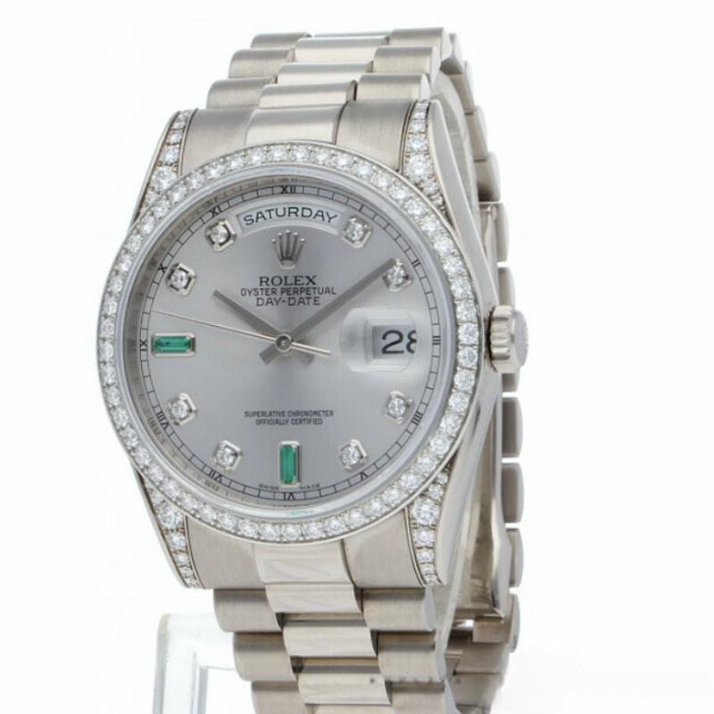 The Rolex Day-Date 118389, unisex white gold replica and 36mm silver dial, it features a 36mm white gold case, silver dial with diamonds and emeralds set. Time markers with round brilliant diamonds and baguette emerald diamonds at 6 and 9. Scratch resistant sapphire crystal with Cyclops magnifying glass. Day of the week window at 12. Date window at 3. White gold presidential bracelet with folding buckle.
