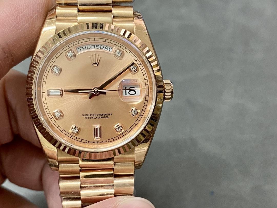 Rolex Day-Date 128235 Everose Gold unisex replica watch with 36 mm pink dial. Everose rose gold Oyster case with 36 mm diameter, screwed back, screwed crown with Twinlock double sealing system, fluted bezel, scratch-resistant sapphire crystal with Cyclops magnifying glass, pink dial with diamond hour markers, outer divisions of minutes and 1/2 seconds, window for the day at 12, window for the date at 3. Everose gold President bracelet with three-piece semicircular links and hidden Crownclasp folding clasp.