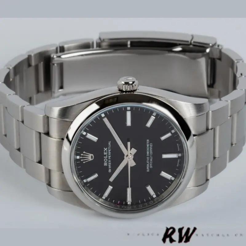 Rolex Oyster Perpetual Air-King 114200 unisex replica watch with black dial and 34 mm indices. 34 mm diameter stainless steel case. Smooth and fixed domed stainless steel bezel. Black dial with luminescent hands and indexes. Minute trees on the outer edge. Scratch resistant sapphire crystal. Screw-down crown. Solid caseback. Stainless steel Oyster bracelet with folding clasp.