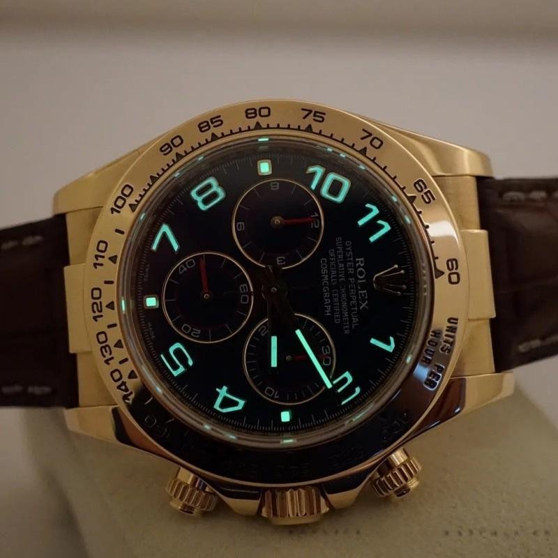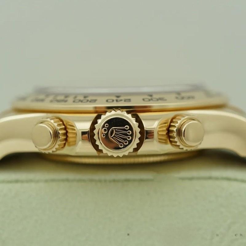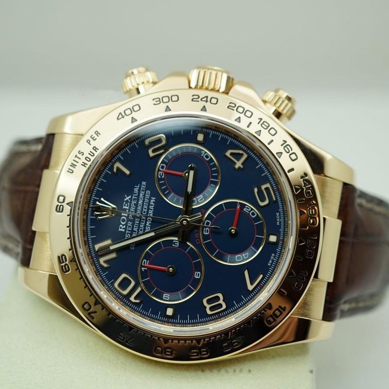 The Rolex Cosmograph Daytona 116518 Yellow Gold Blue Dial 40mm Replica Men’s Watch features a practical 40mm yellow gold case with a matte cobalt blue dial, red chronograph hands and exceptionally luminescent yellow gold Arabic numerals. Special screwed buttons. Yellow gold bezel with tachymetric engraving. Scratch resistant sapphire crystal. Blue dial with Arabic numerals. Small seconds hand at 6 a.m. Central chronograph hand, 30-minute counter at 3 o’clock and 12-hour counter at 9 o’clock. Brown leather strap with yellow gold folding buckle.