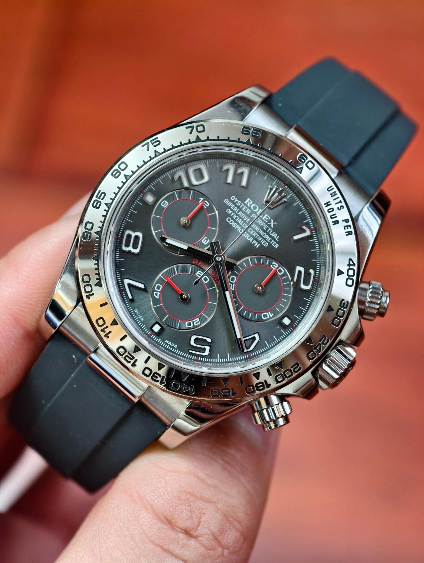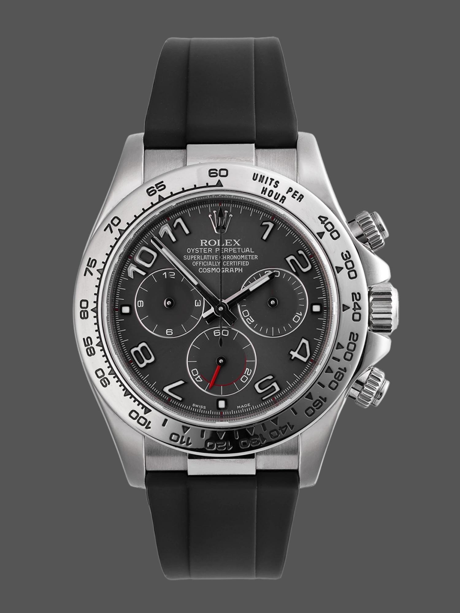 Rolex Cosmograph Daytona 116519 men’s watch, gray racing dial, 40 mm. The 40mm white gold case features a Triplock crown and two screwed chronograph pushers. The gray racing dial features three gray counters and gray gold luminescent indexes and hands. The fixed domed tachymetric bezel and scratch-resistant sapphire crystal feature a stunning slate dial with red hands. The watch includes a black rubber strap with red stitching.