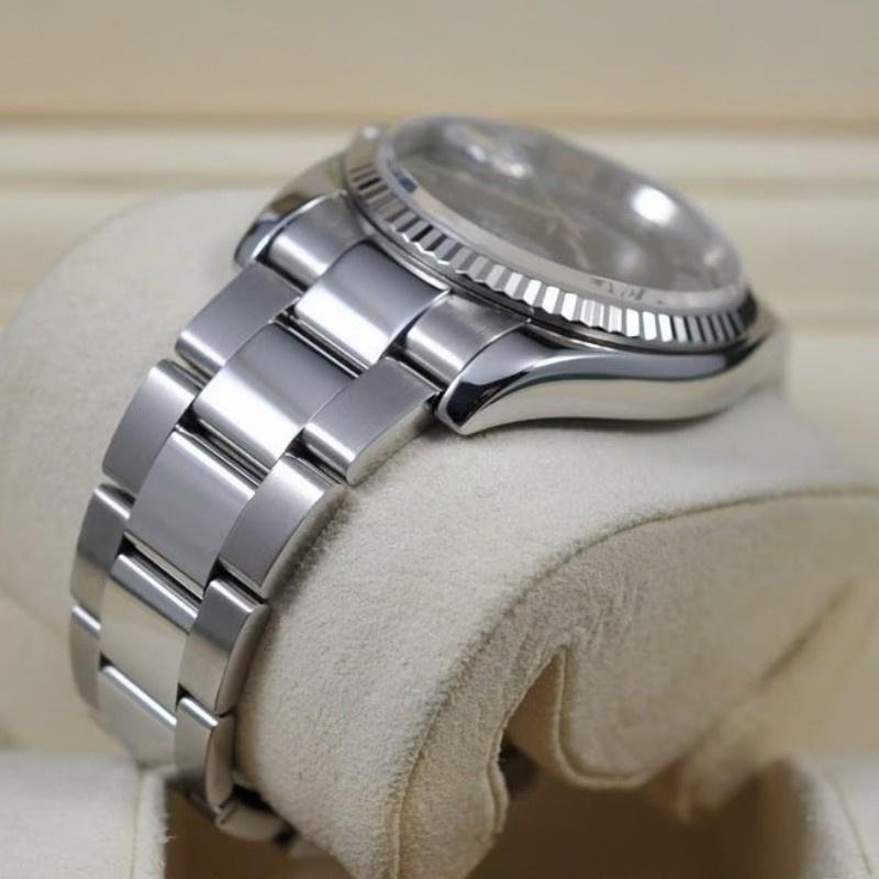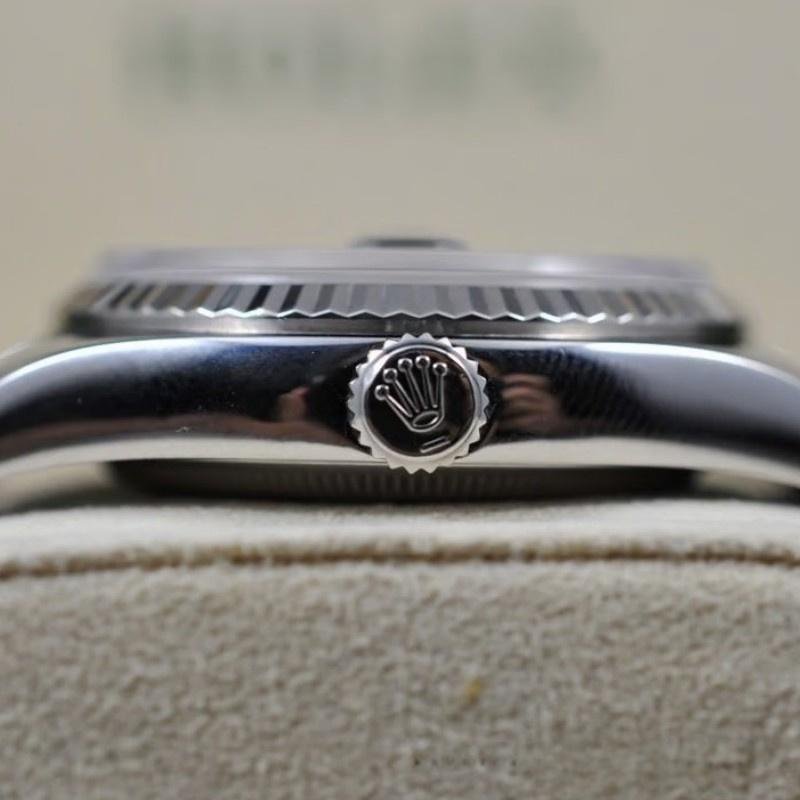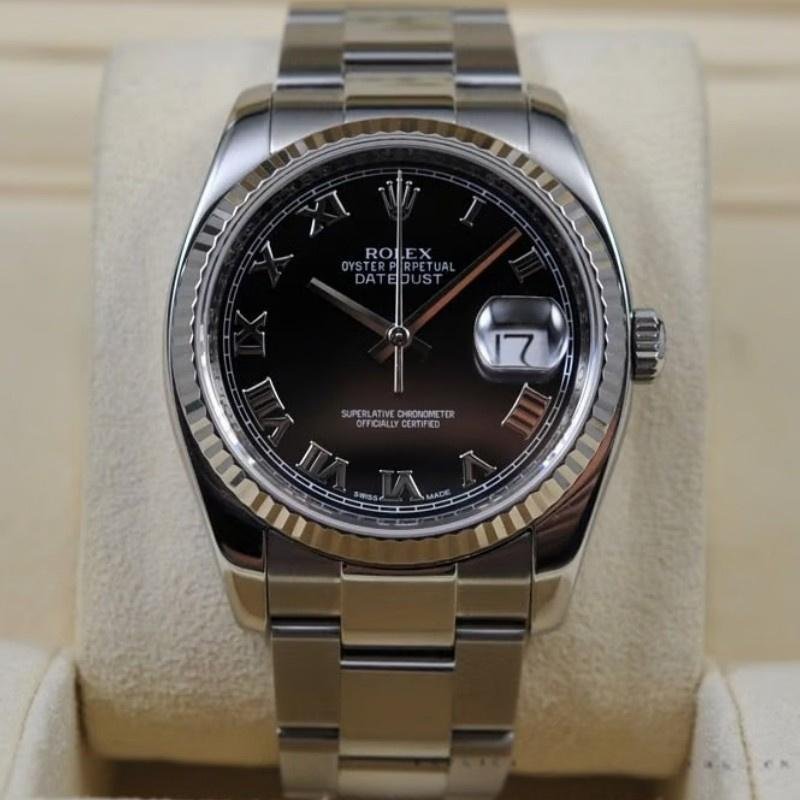 Rolex Datejust 116234 – Unisex 36mm replica with Roman numerals and black dial. 36mm stainless steel Oystersteel case. Black dial, hour markers with Roman numerals, white gold fluted bezel. Oyster stainless steel bracelet. Date window at 3 o’clock, Cyclops lens over date, scratch-resistant sapphire crystal.