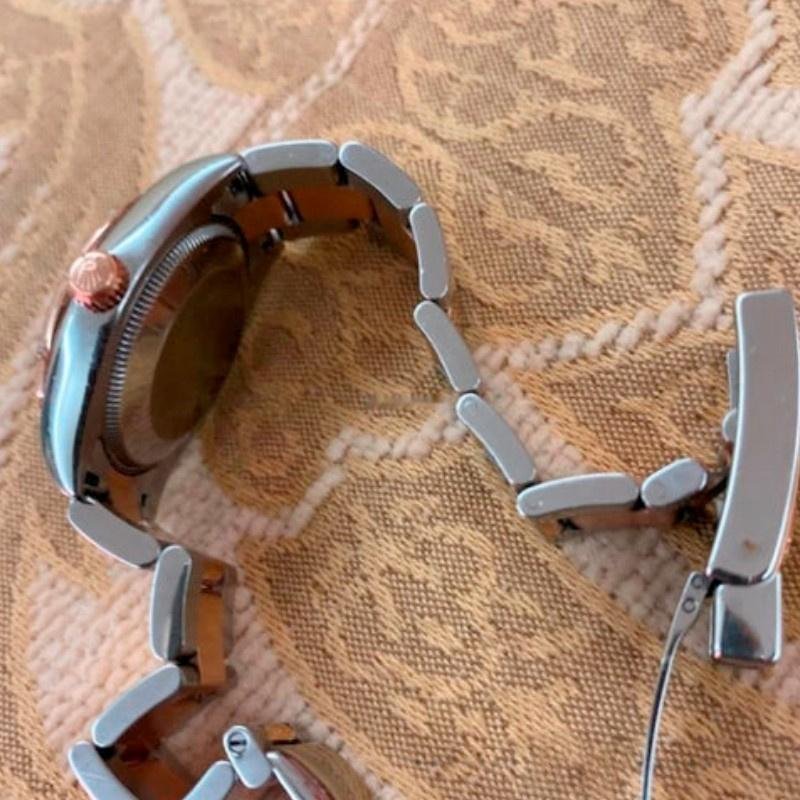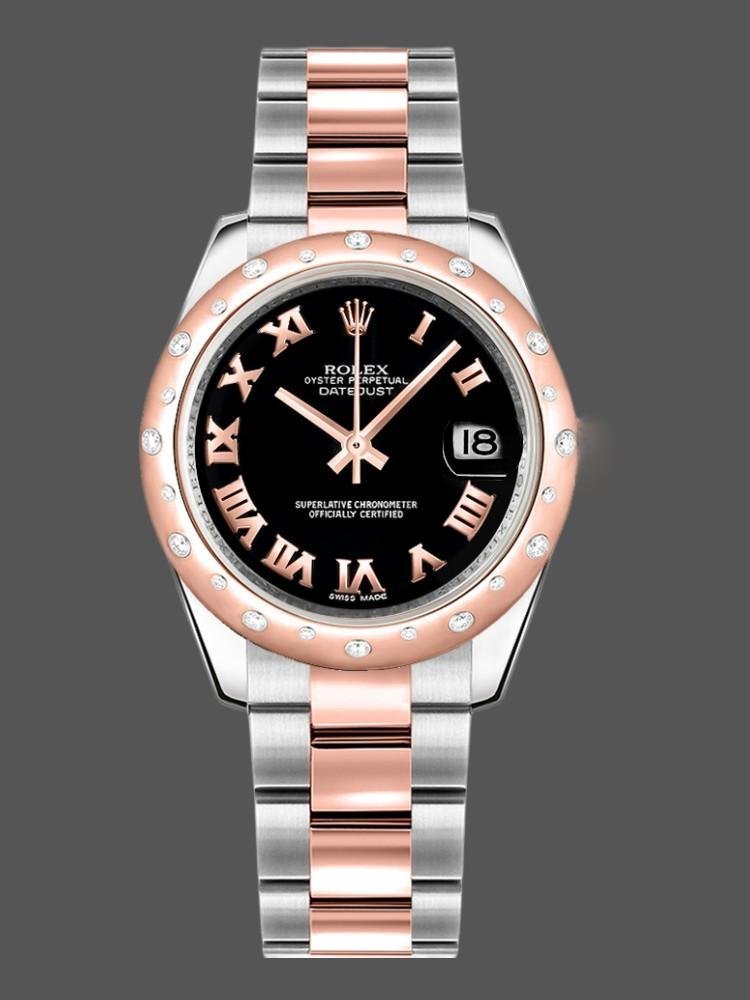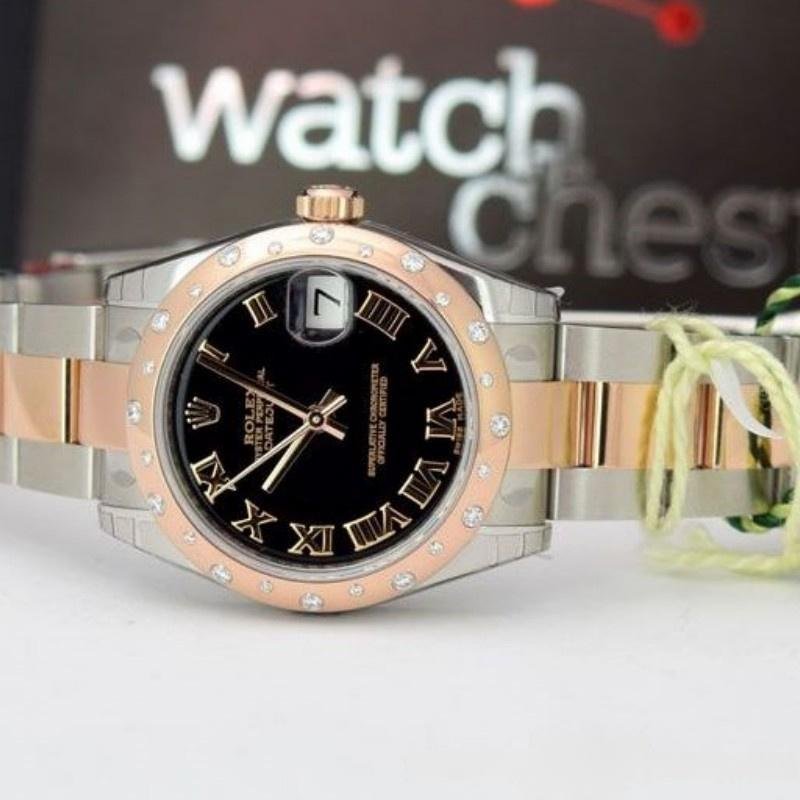 Rolex Datejust 178341 – 31mm women’s replica with black dial and Roman numerals. 31 mm Rolesor Everose case in Oystersteel and Everose gold, screwed back and crown with Twinlock double-sealing system, Everose gold domed bezel with 24 diamonds set, scratch-resistant sapphire crystal with Cyclops lens on the date, black dial with Roman numerals and calendar at 3. Two-tone stainless steel and rose gold bracelet with folding clasp.