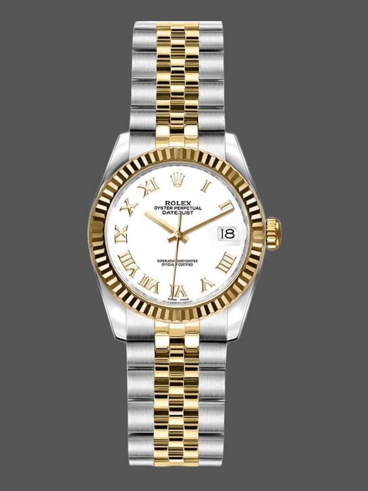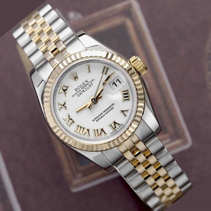 Rolex Datejust 179173, white dial with Roman numerals, 26 mm, replica for women. 26 mm diameter stainless steel Oyster case. Yellow gold fluted bezel. Scratch resistant sapphire crystal with Cyclops magnifying glass. White dial with Roman numeral hour markers. Calendar with window at 3. Jubilee stainless steel and yellow gold bracelet with hidden clasp.