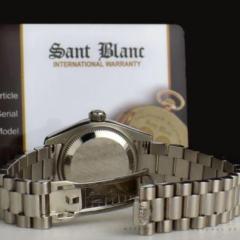 Rolex Datejust 179179 Women’s Replica Watch, Black Dial with Roman Numerals, Fluted Bezel, 26mm, 26mm Diameter White Gold Oyster Case. White gold fluted bezel. Scratch resistant sapphire crystal with Cyclops magnifying glass. Black dial with Roman indexes. Calendar with window at 3. President white gold bracelet with hidden clasp.