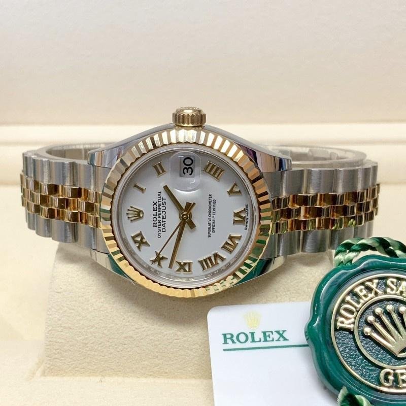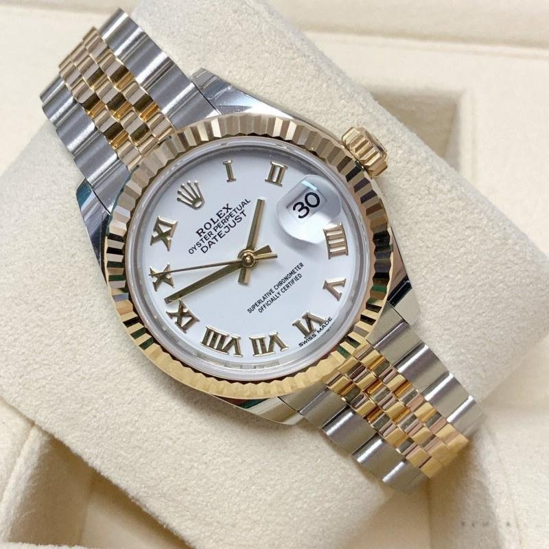 Rolex Datejust 279173 women’s watch, white dial with Roman numerals and fluted bezel, 28 mm. 28mm yellow gold case and polished solid yellow gold fluted bezel. Scratch resistant sapphire crystal with Cyclops magnifying glass. White dial with Roman numeral hour markers. Calendar with window at 3. Stainless steel bracelet with yellow gold center links.