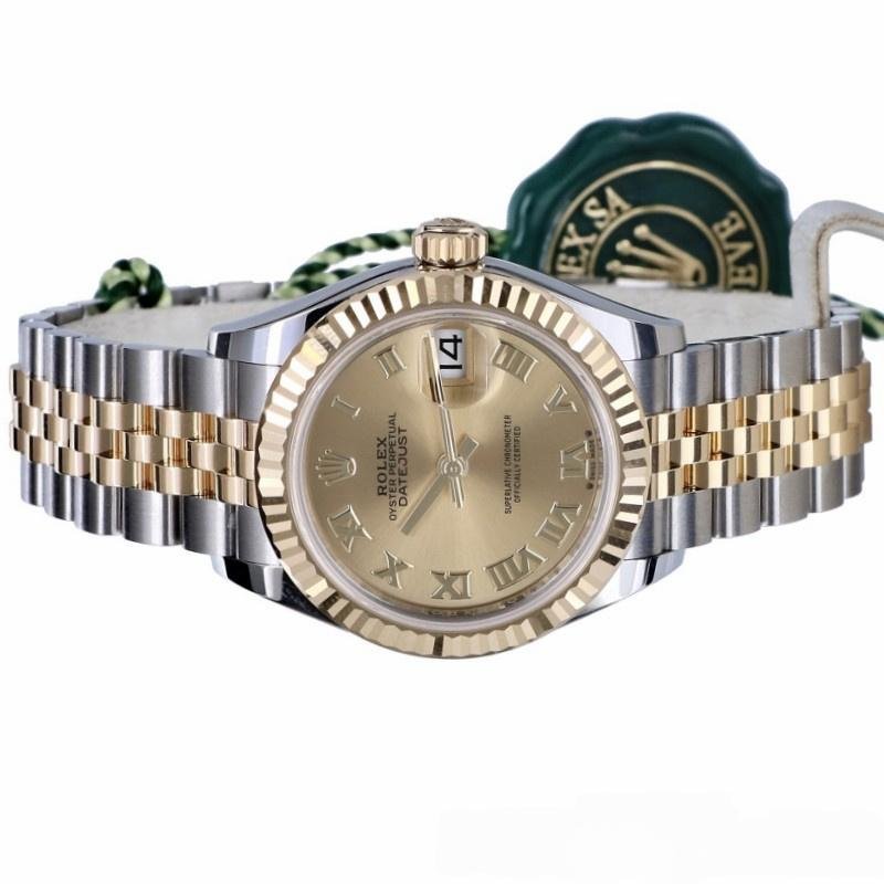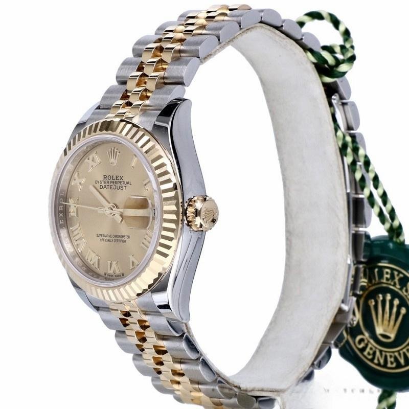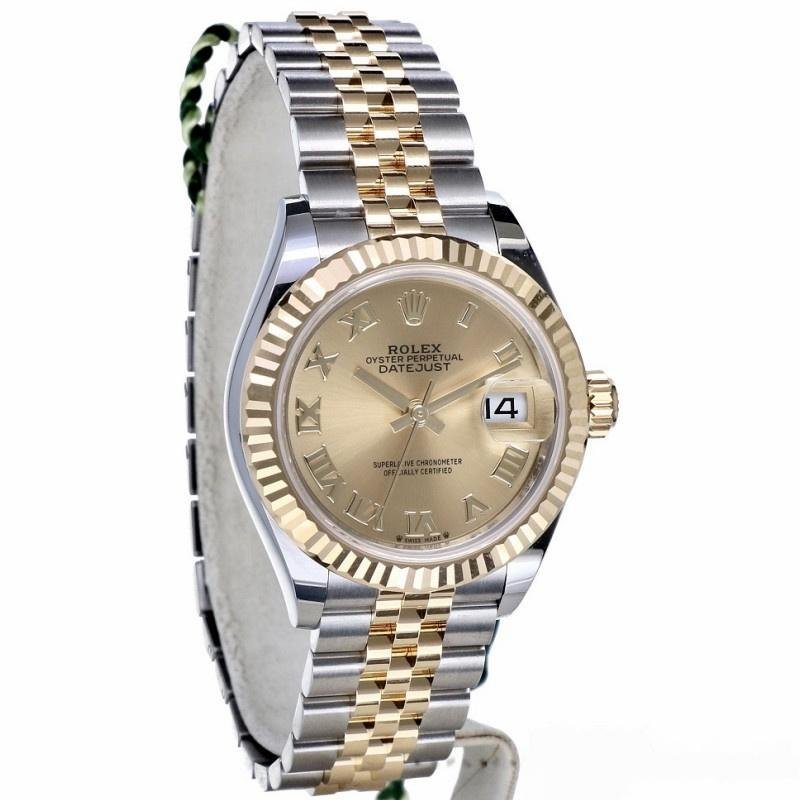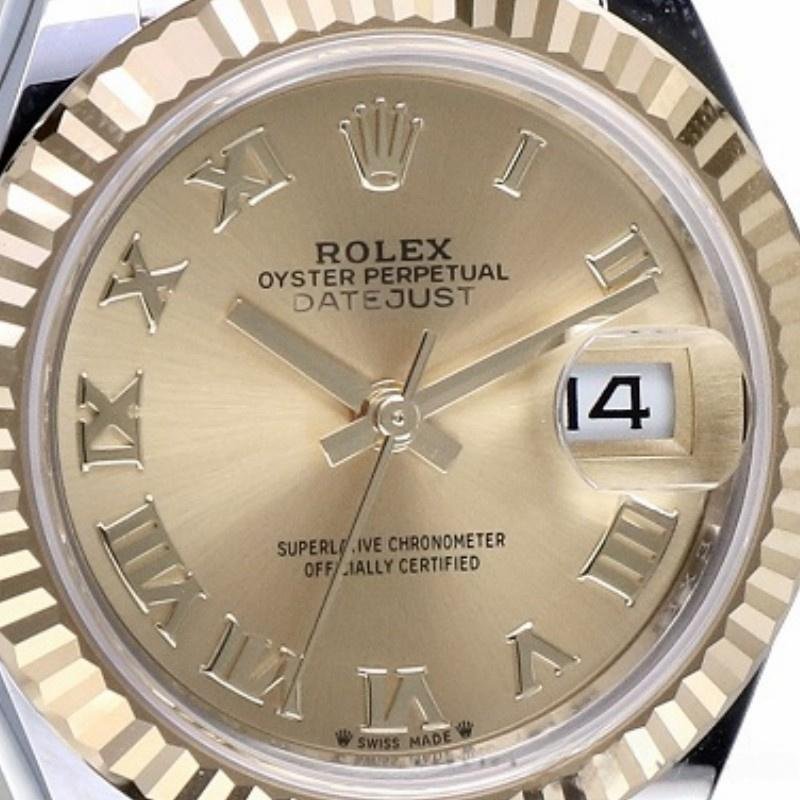 Rolex Datejust 279173 women’s watch, champagne-colored Roman numeral dial, fluted bezel, 28 mm. 28mm yellow gold case and polished solid yellow gold fluted bezel. Scratch resistant sapphire crystal with Cyclops magnifying glass. Champagne-colored dial with Roman numeral hour markers. Calendar with window at 3. Stainless steel bracelet with yellow gold center links.