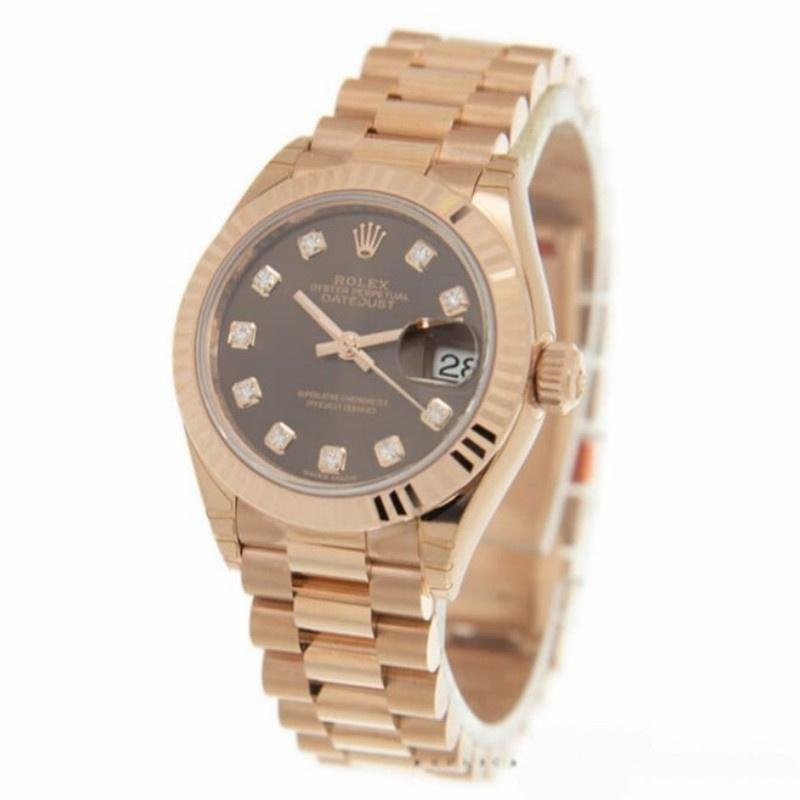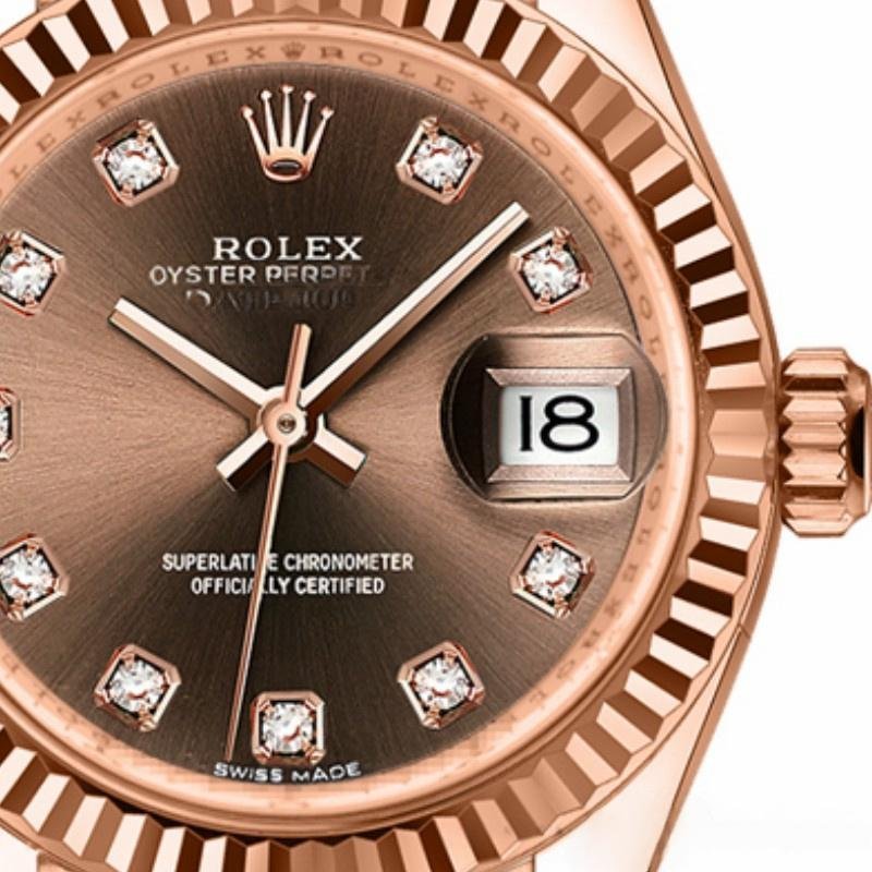Rolex Datejust 279175 women’s watch, replica, chocolate dial with diamonds and fluted bezel, 28 mm. 28mm round rose gold case with screw-down crown and rose gold fluted bezel. Chocolate dial with diamond hour markers. Calendar with window at 3. Everose gold President bracelet with three-piece semicircular links and hidden Crownclasp folding clasp.