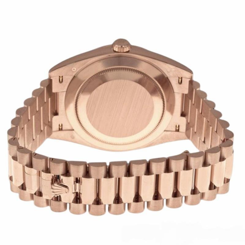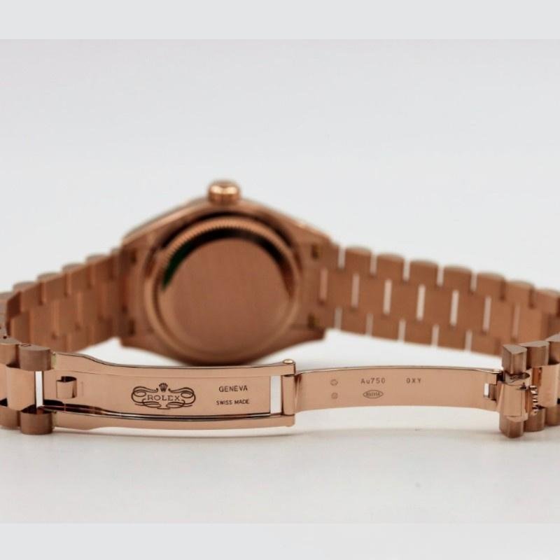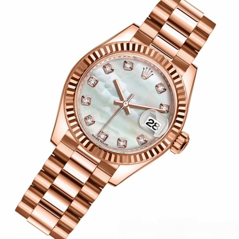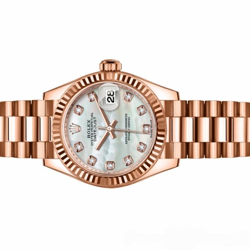 Rolex Datejust 279175 women’s watch, replica, mother-of-pearl dial with diamonds and fluted bezel, 28 mm. 28mm round rose gold case with screw-down crown and rose gold fluted bezel. Mother-of-pearl dial with diamond hour markers. Calendar with window at 3. Everose gold President bracelet with three-piece semicircular links and hidden Crownclasp folding clasp.