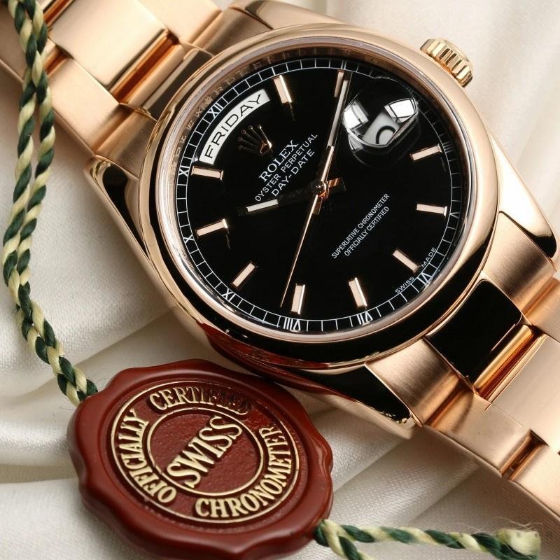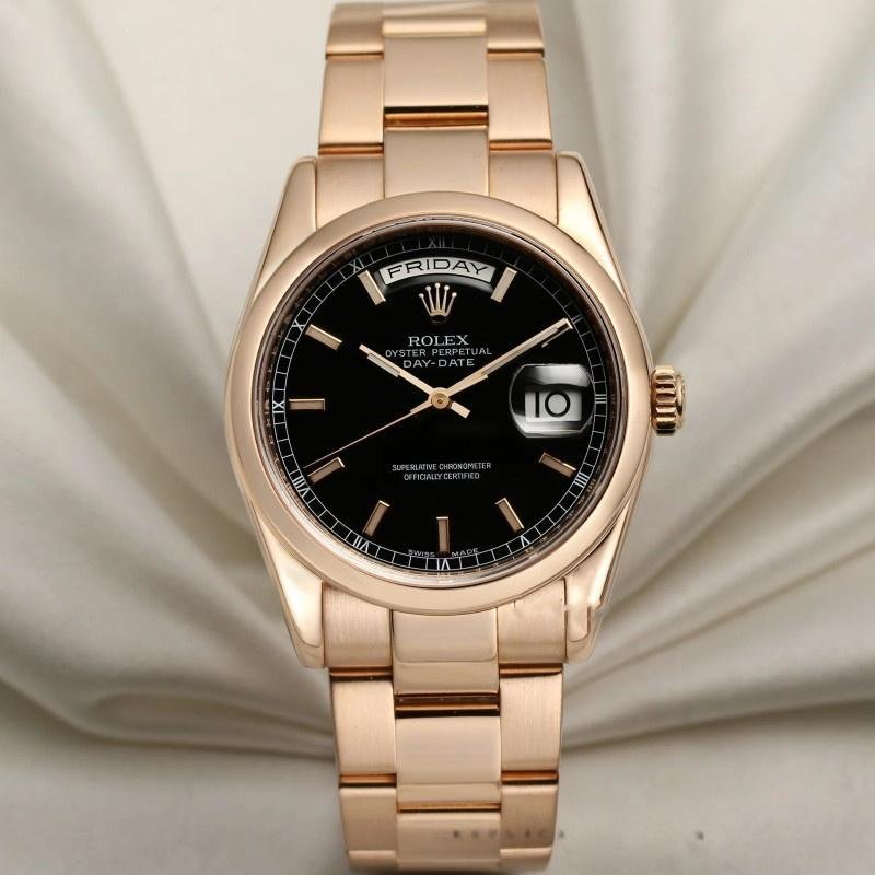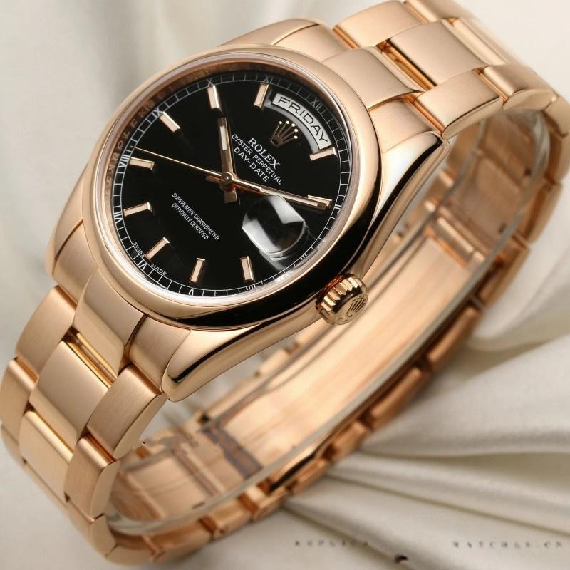 Rolex Day Date 118205 replica watch, black dial, rose gold, 36 mm, unisex. 36mm round case. Everose gold domed fixed bezel. Black dial with rose gold hands and hour markers with indexes. Minute trees on the outer edge. Date at 3 a.m.; day at 12 noon. Automatic movement. Scratch resistant sapphire crystal. Screw-down crown. Solid caseback. Hidden crown closure.