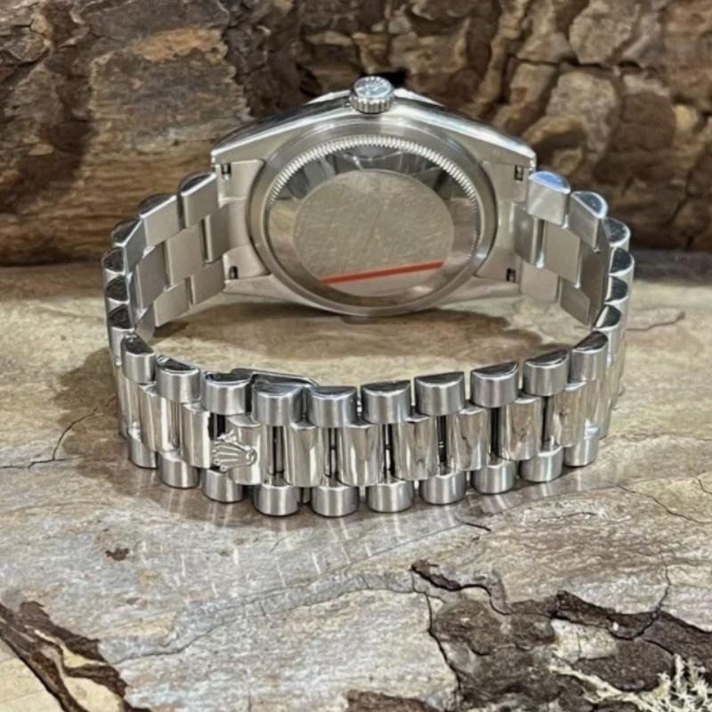 Automatic: Lifetime water resistant, Swiss: 30 meters, TOP: 100 meters Availability: Available item Return policy: If you are not satisfied with our product, please return the watch within 30 days for a full refund. Condiciones return. Rolex Day-Date 118206 watch, rhodium-plated gray dial, Roman numerals, 36 mm, unisex. The rhodium-plated gray dial with Roman numerals marks the hours on the President bracelet. The platinum version with a smooth bezel is perfect for small men’s or women’s wrists, thanks to its 36 mm case. The day of the week at 12, written entirely in any language in the world, is a feature of these watches. Available exclusively in precious metals, this bracelet features three rows of smooth, flat links that won’t damage a shirt cuffs. Recommendation: Choose TOP SWISS or swiss movement Customer reviews