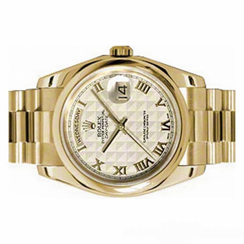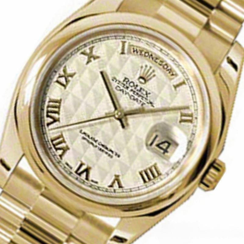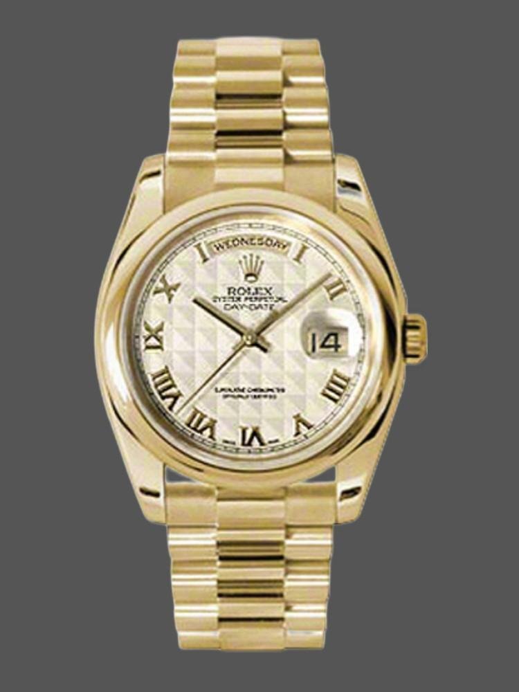 Rolex Day-Date 118208 Replica Yellow Gold Roman Numerals Ivory Pyramid Dial 36mm Unisex