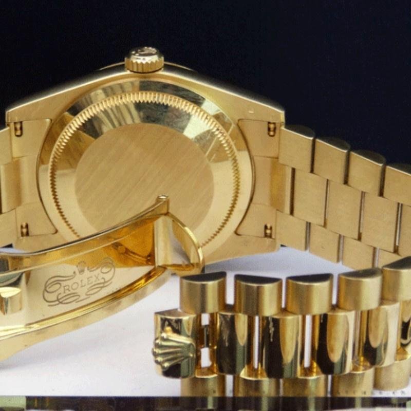 Rolex Day-Date 118208 yellow gold watch, ivory dial and pyramidal Roman numerals, unisex, 36 mm. It features a 36mm round yellow gold case with screw-down crown and yellow gold bezel. Ivory pyramidal dial with yellow gold hands and hour markers in Roman numerals. Minute markers around the outer edge. Scratch resistant sapphire crystal. Screw-down crown. Solid caseback. Round box. The reliable yellow gold Rolex Oyster bracelet will look great on your wrist.