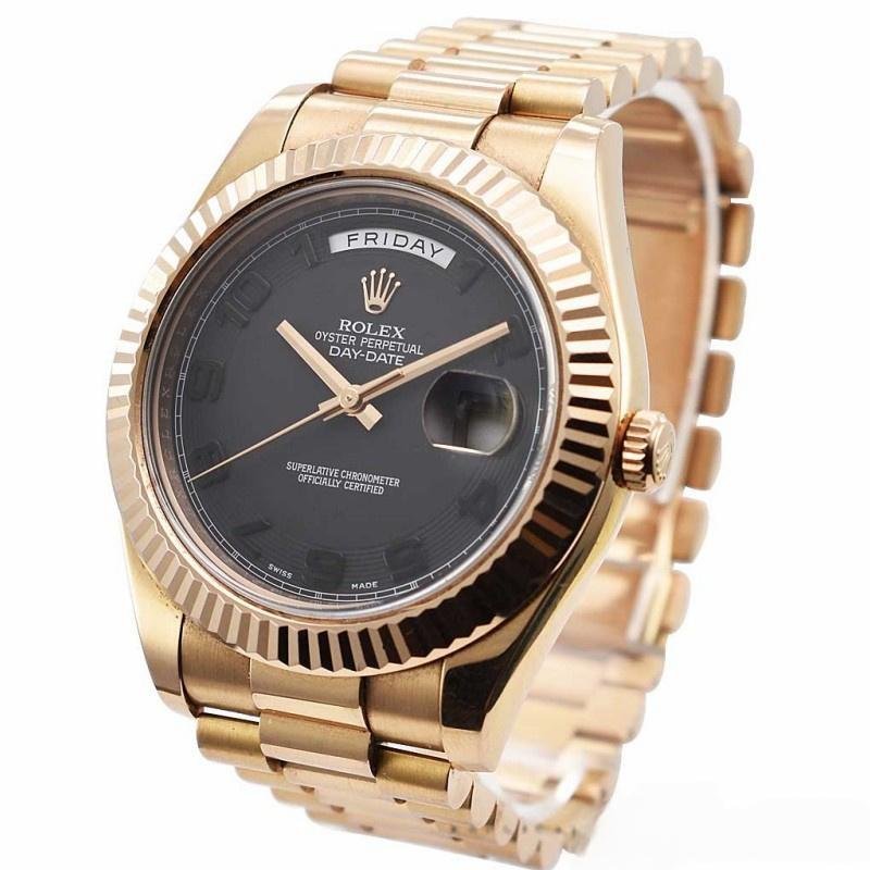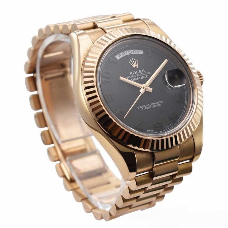 Rolex Day-Date 218235 Men’s Watch Replica Black Concentric Arabic Dial Rose Gold 41mm. 41mm rose gold case with solid bottom, screw-down crown and rose gold ribbed bezel. Scratch resistant sapphire crystal with Cyclops magnifying glass. Black concentric dial with hour markers in Arabic numerals. Date window at 3 and day window at 12. Three-link presidential bracelet in rose gold with folding clasp.