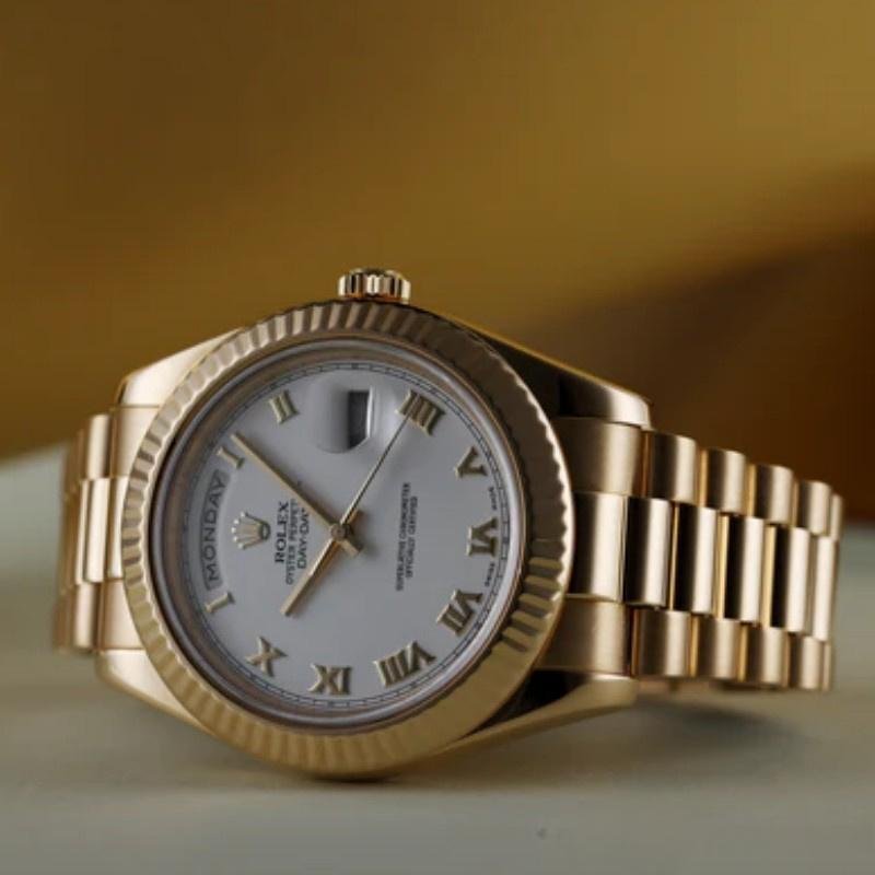 Rolex Day-Date 218238 men’s watch, 41 mm yellow gold replica with white dial and Roman numerals. It features a 41mm yellow gold case with a solid bottom, screw-down crown and fluted yellow gold bezel. Scratch resistant sapphire crystal with Cyclops magnifying glass. White dial with Roman numeral hour markers. Date window at 3 and day window at 12. Three-link yellow gold presidential bracelet with folding clasp.